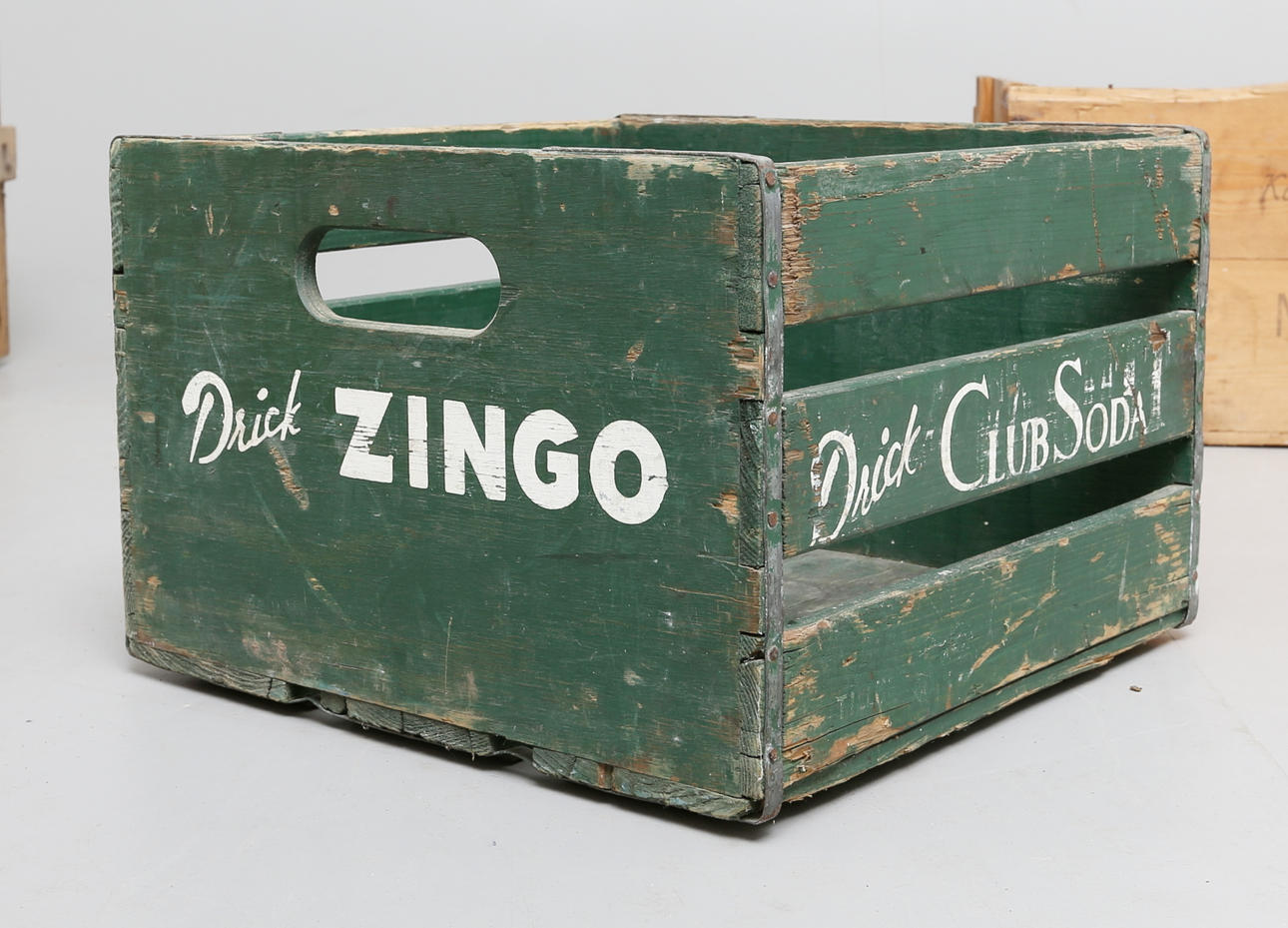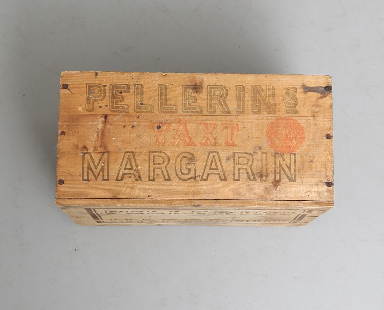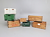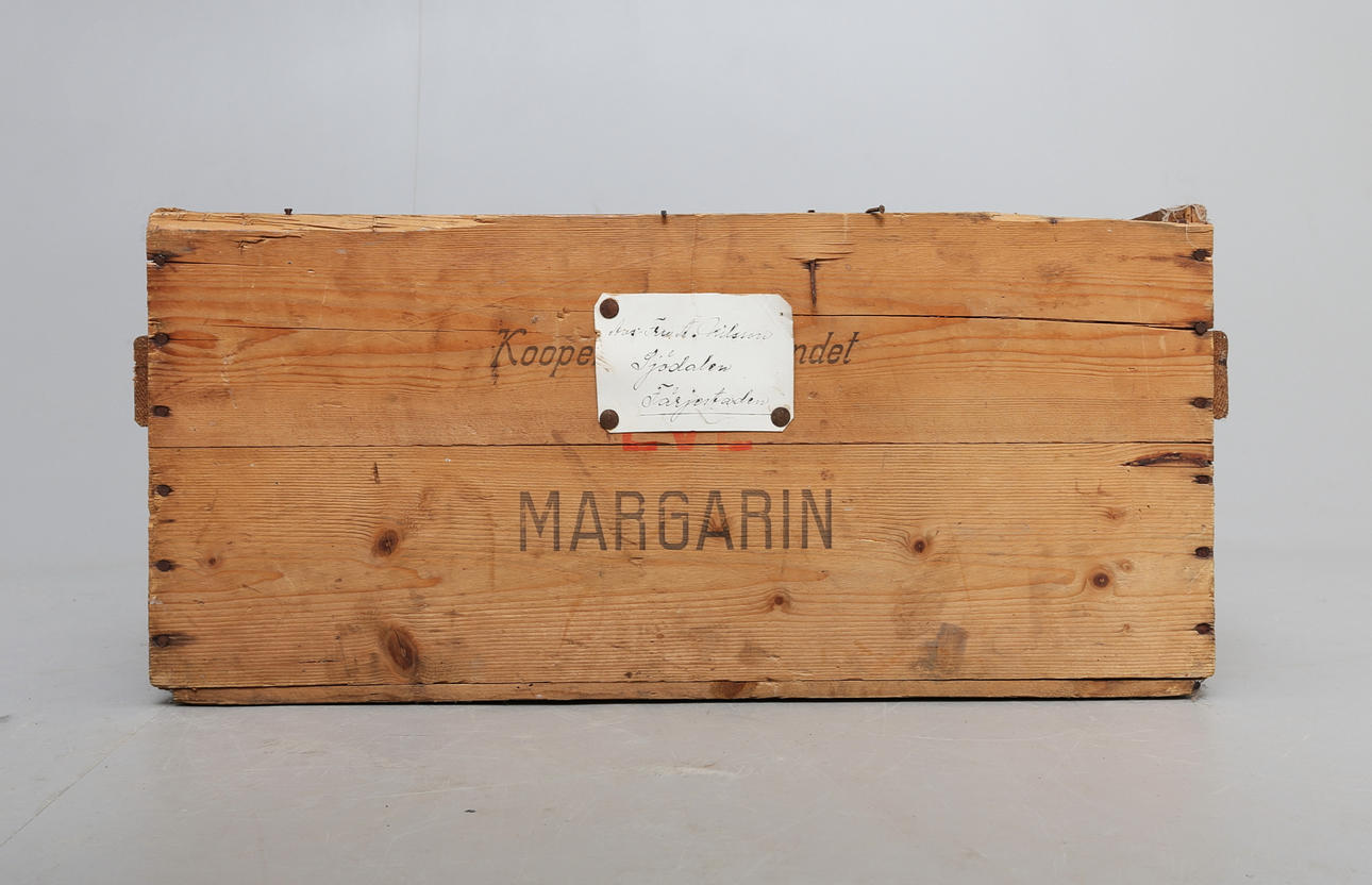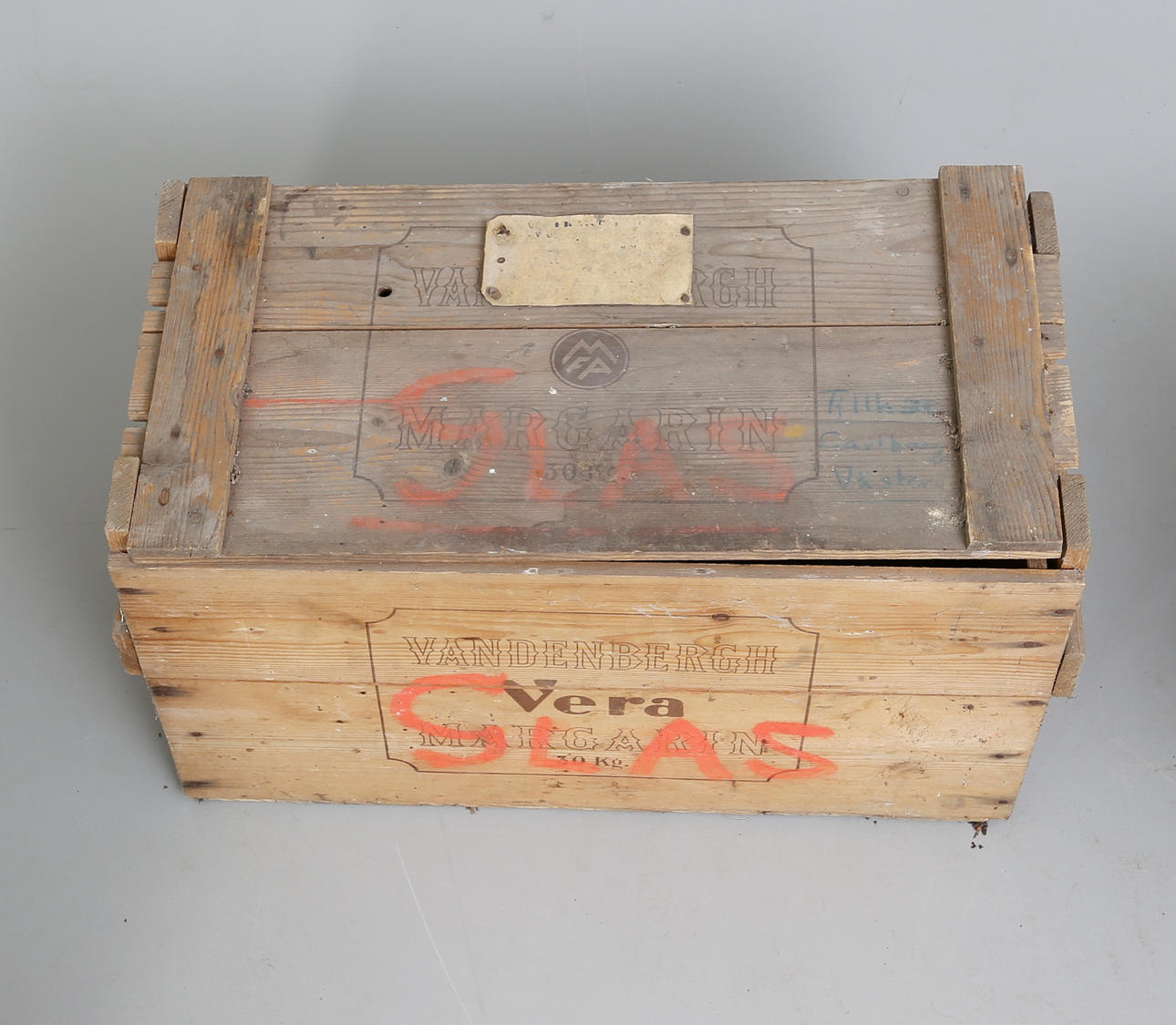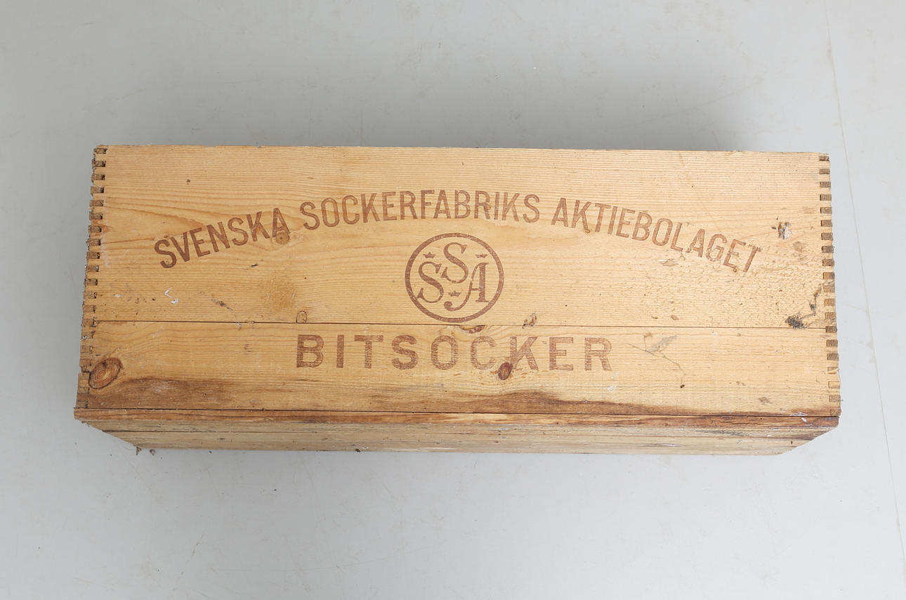 Lådor för bland annat flaskor. Med tryckta texter; Svenska Sockerfabriksbolaget, Margarin, Diplom med mera.