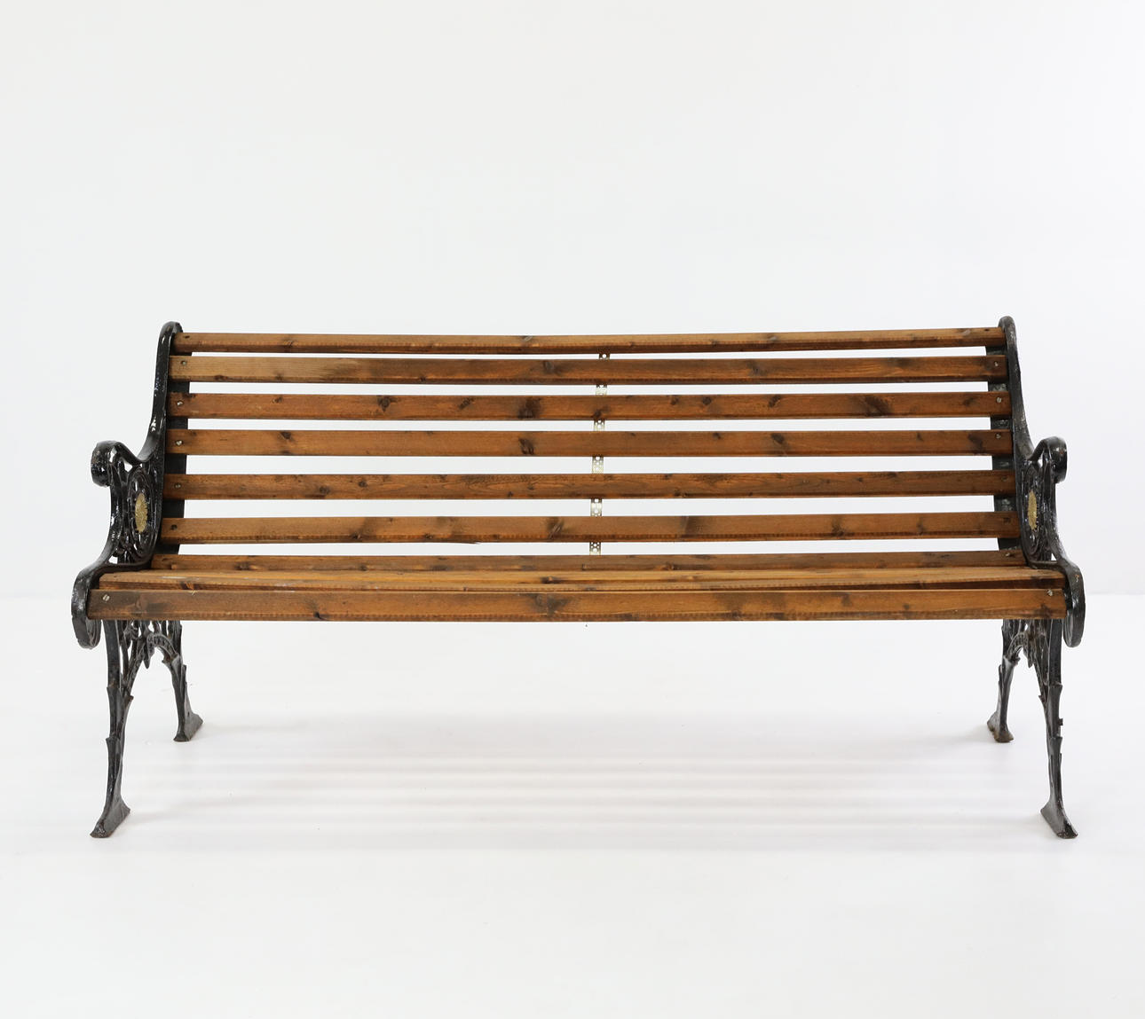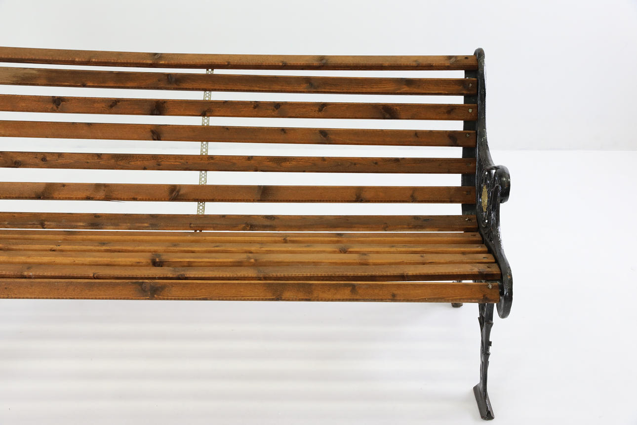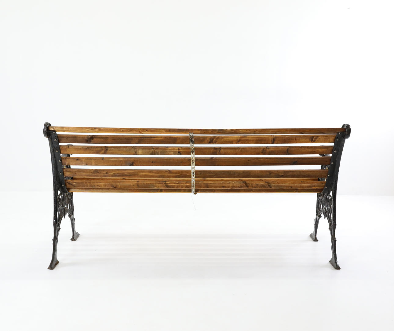 Gjutna gavlar. Träribbor. Längd 154 cm Höjd 77,5 cm Djup 67 cm Sitthöjd 41 cm.