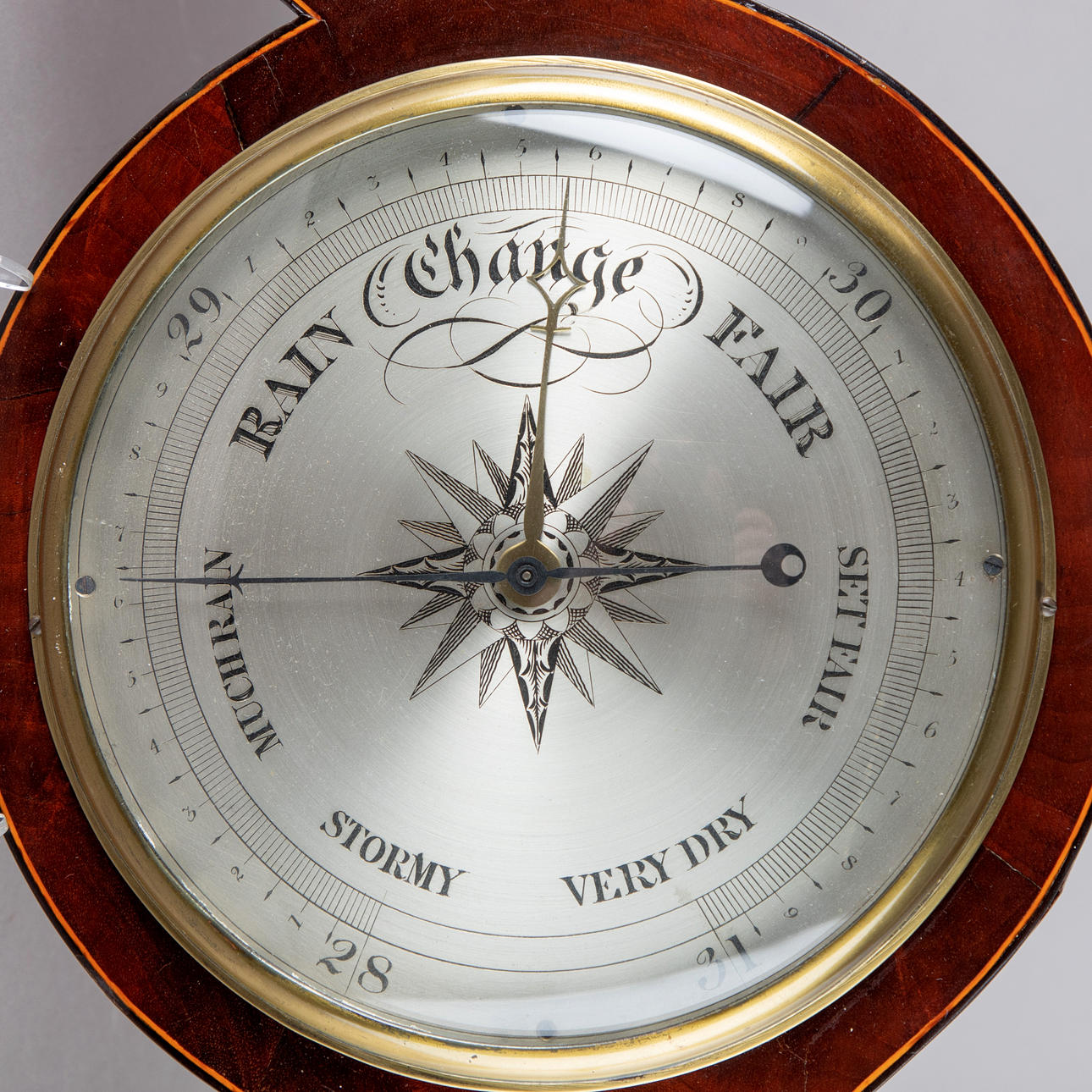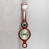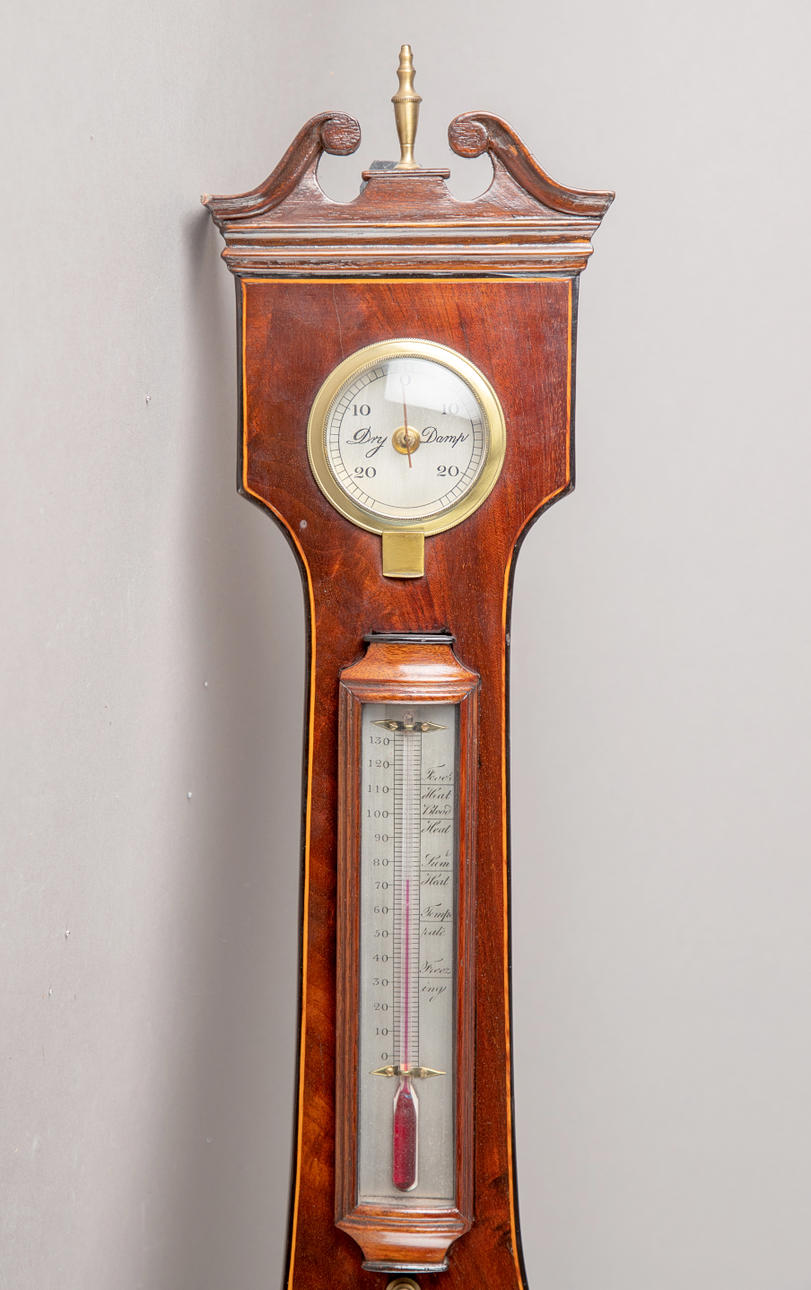 Mahogny/mässing Ledad kropp med trådinlägg på kanterna och en trasig pediment. Slutligen med en hygrometer upptill, med ett vattenpass i botten.