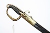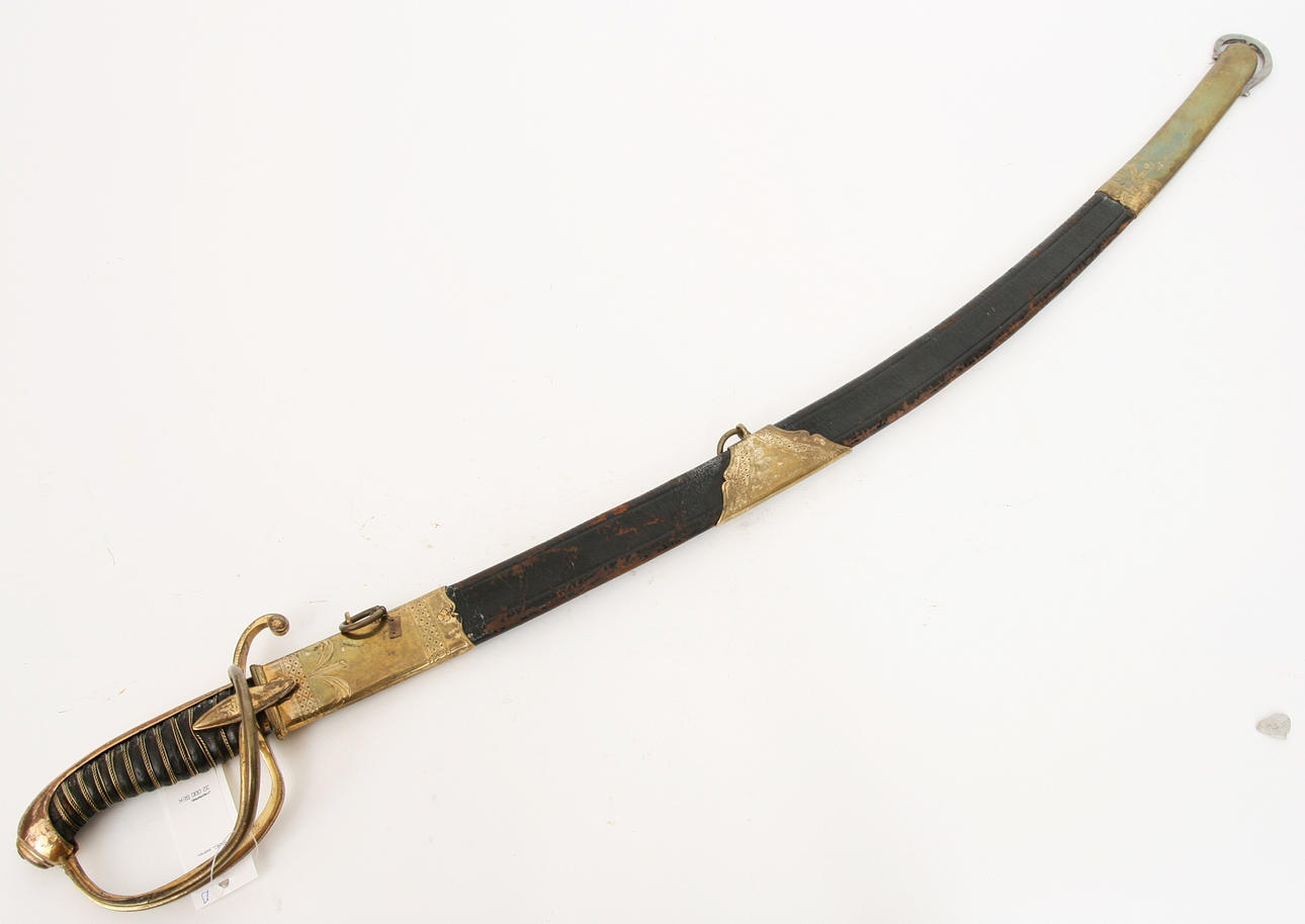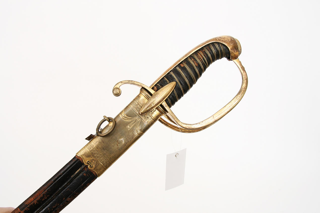 för artilleri off. sk Helvigsabel. Skålslipad klinga, klinglängd ca 80 cm, mässingsfäste, läderbalja med mässingsbeslag. Enl inlämnaren; sabeln är konstruerad och buren av Generalfälttygmästaren Carl Gottfrid Helvig, från Olof P.Bergs samling nr99. Klingan märkt med C.Helvig på anstatsen, omnämd och avbildad i Olof P Bergs bok del 3, sidan 55.