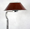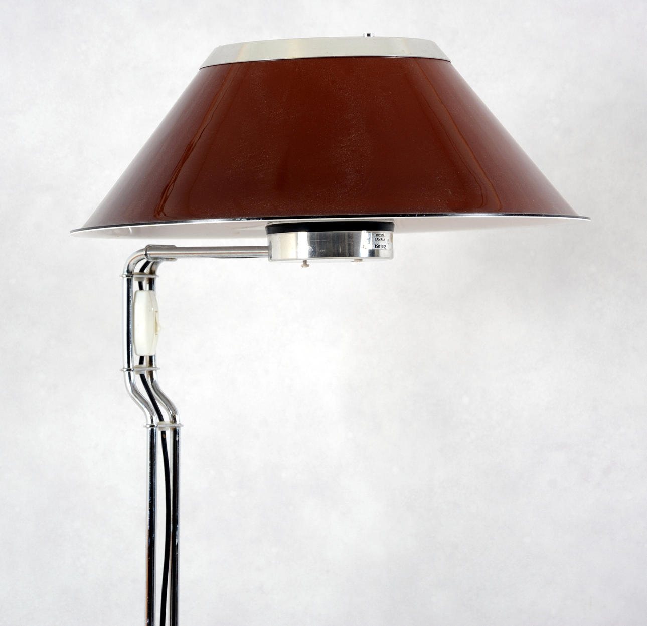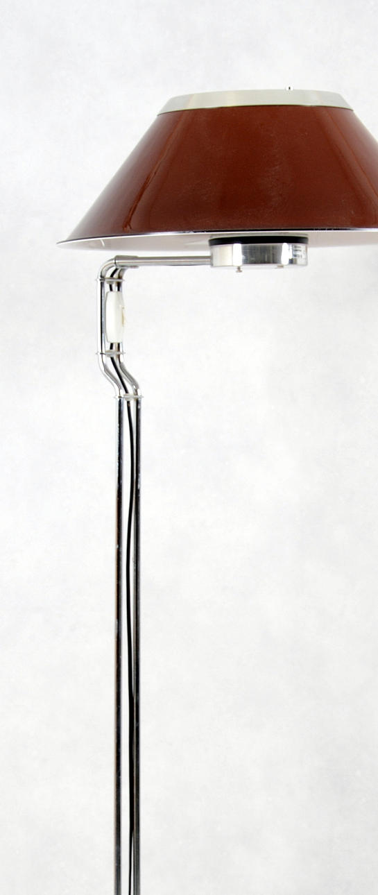 Modell Mars, design Per Sundstedt, Kosta lampan, Åhus. Kromad stomme. Skärm av brunlackerad metall. Höjd ca 127 cm.