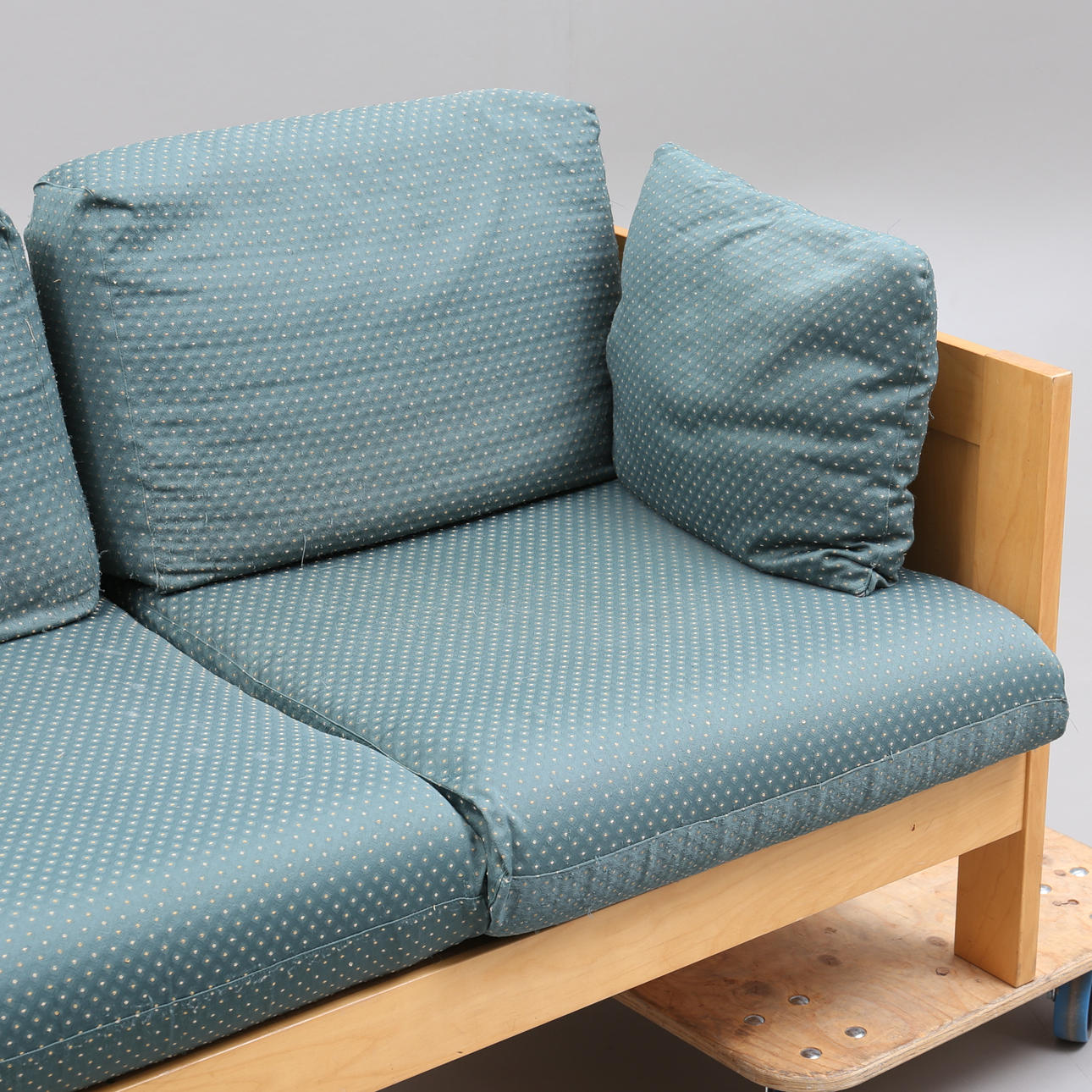 Märken, repor på trästomme. Fläckar, slitage, noppor på dynor.