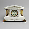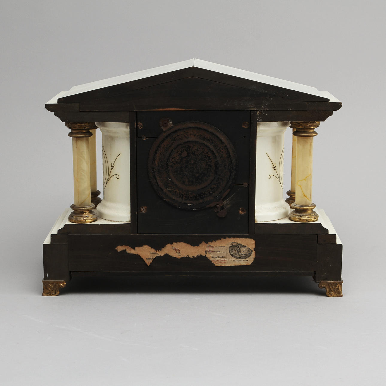 Trä, bronserad metall samt plast. Höjd 29 cm, bredd 42 cm. Urtavla märkt Seth Thomas.