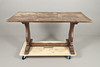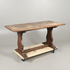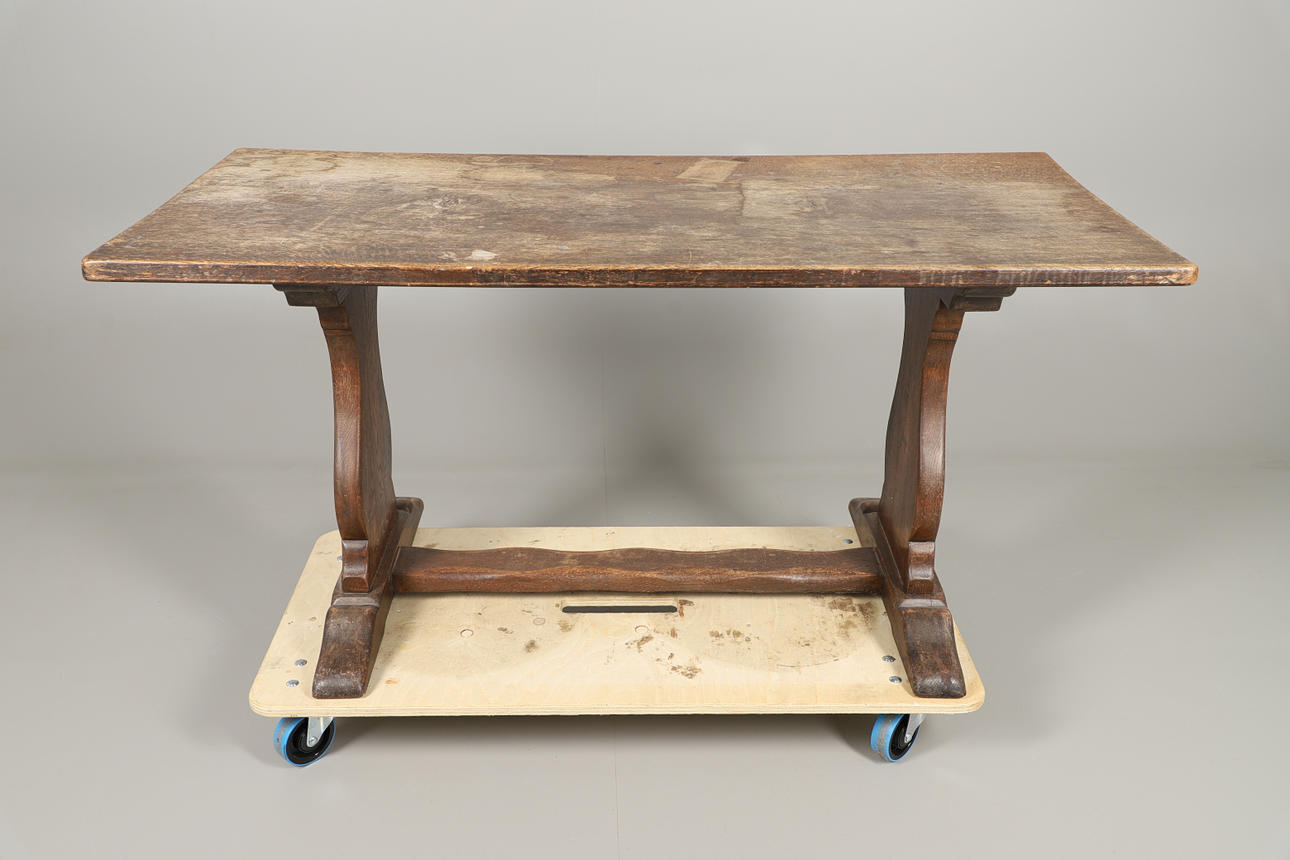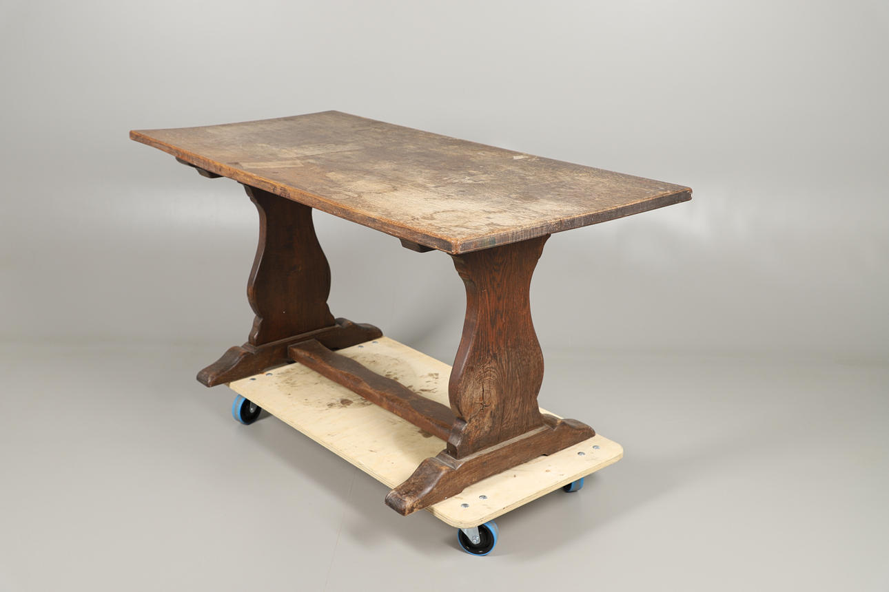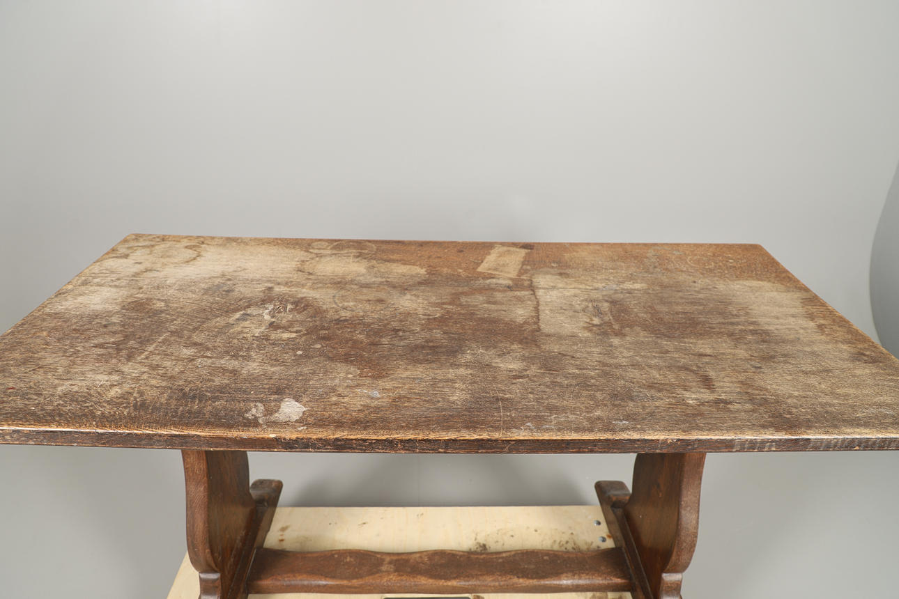 allmänt slitage, repor och märken genomgående, splittringar, överbetsad och bleknad.