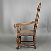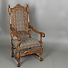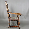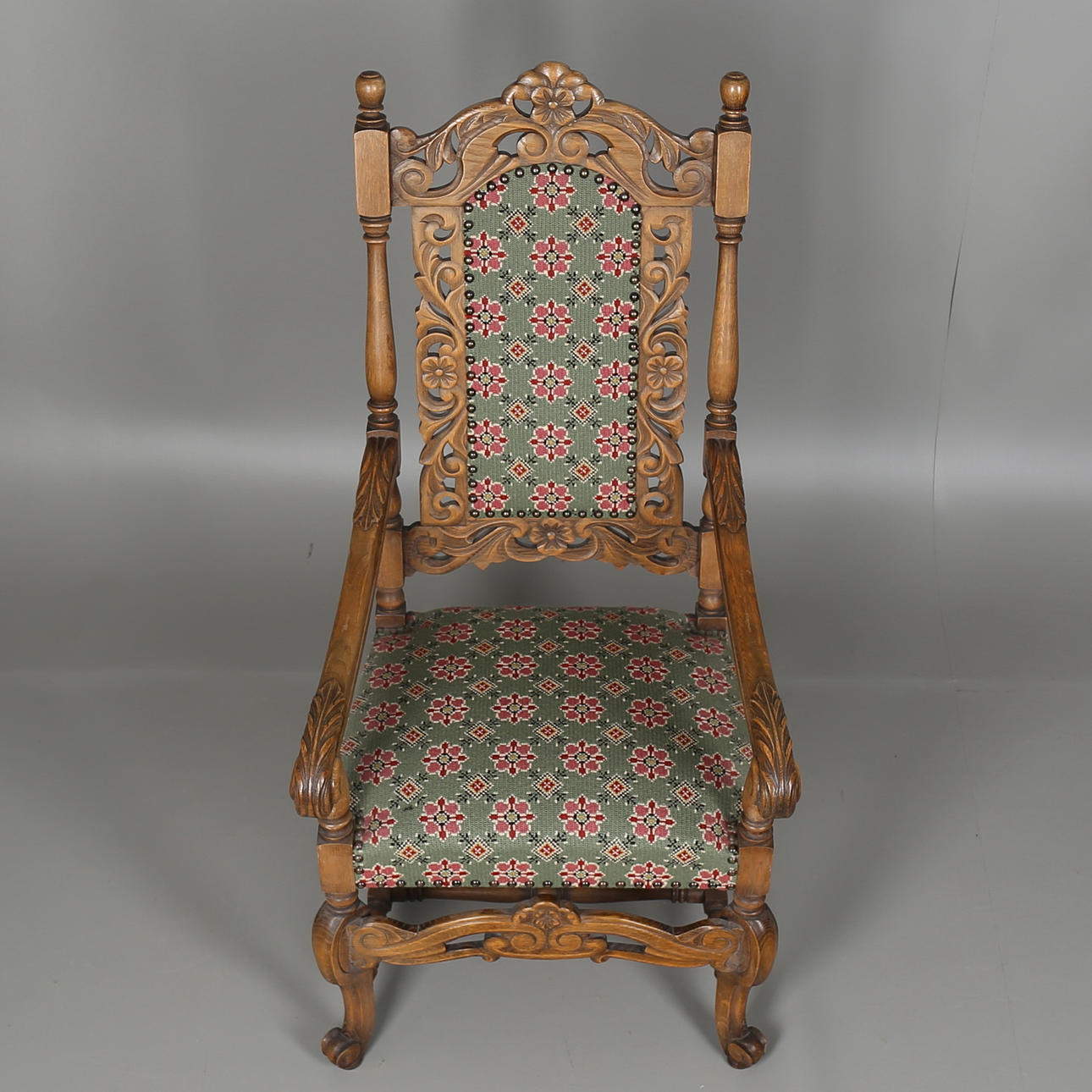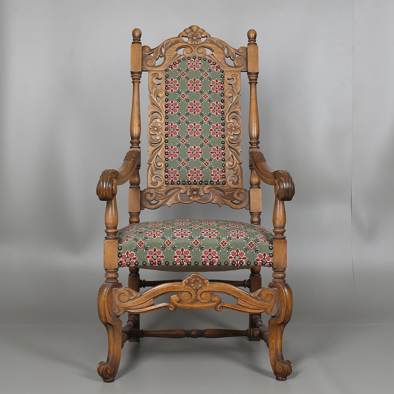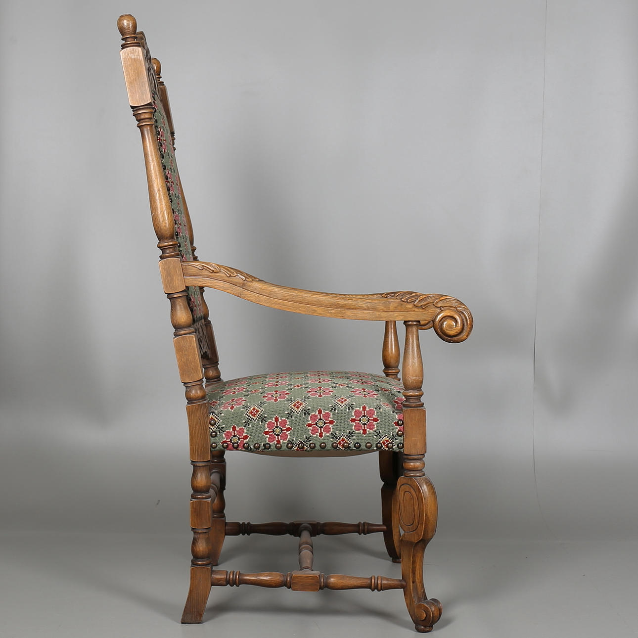 Karmstol i ek med mönstrad klädsel, höjd 126 cm