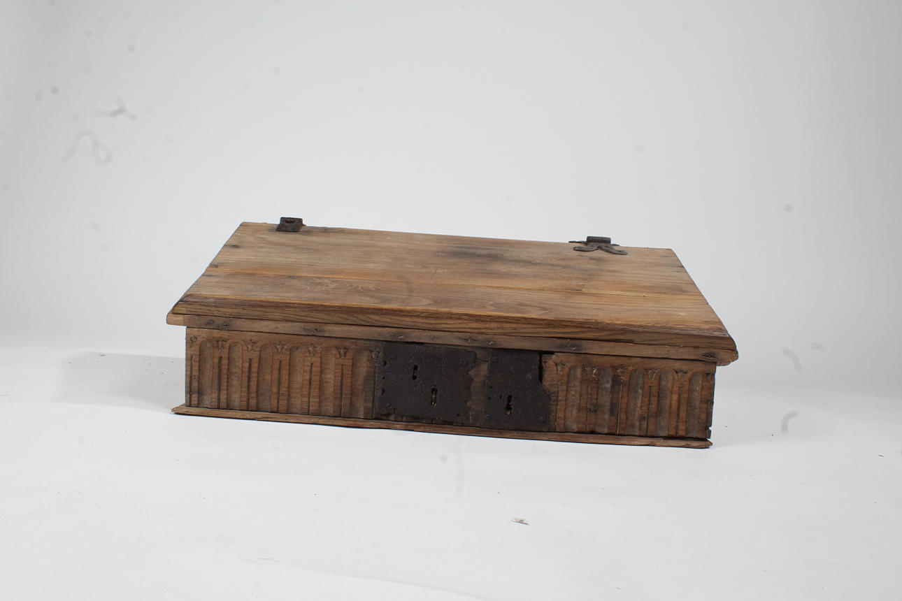 Det sluttande fallet över en snidad fris och två järnlåsplattor, 70cm bred, 48cm djup, 25cm hög.