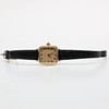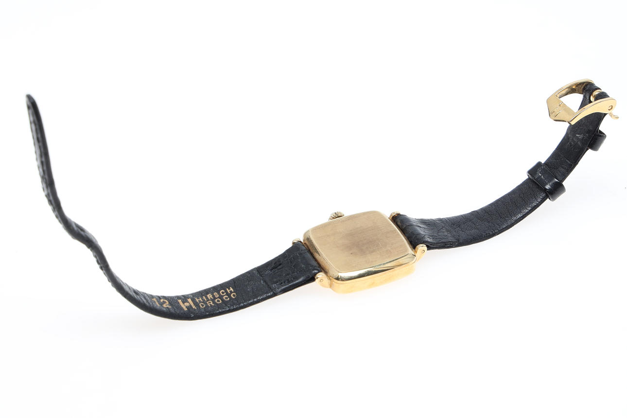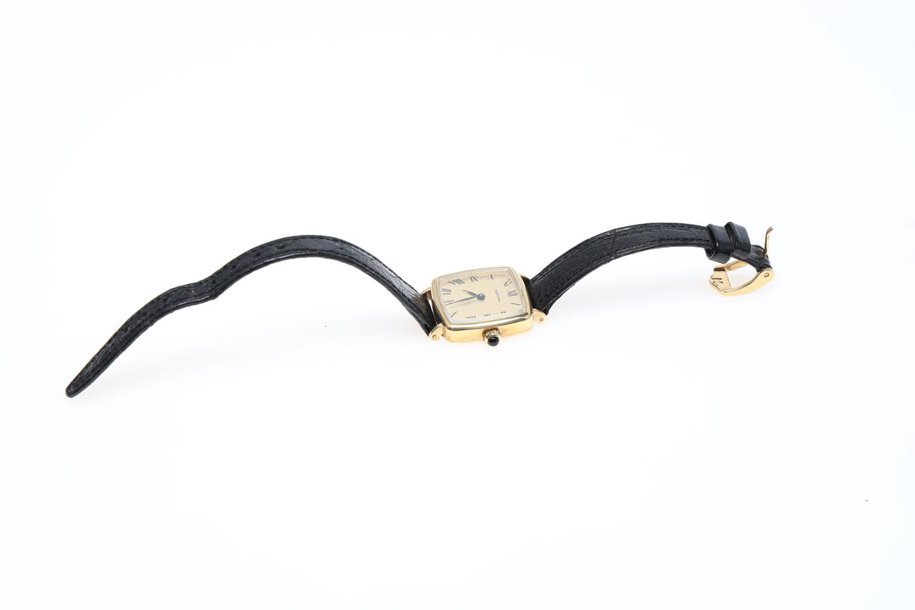 Kvadratisk, champagnefärgad urtavla med romerska siffror. Krona med cabuchonslipad sten. Rem i skinn. B ca 24 mm.