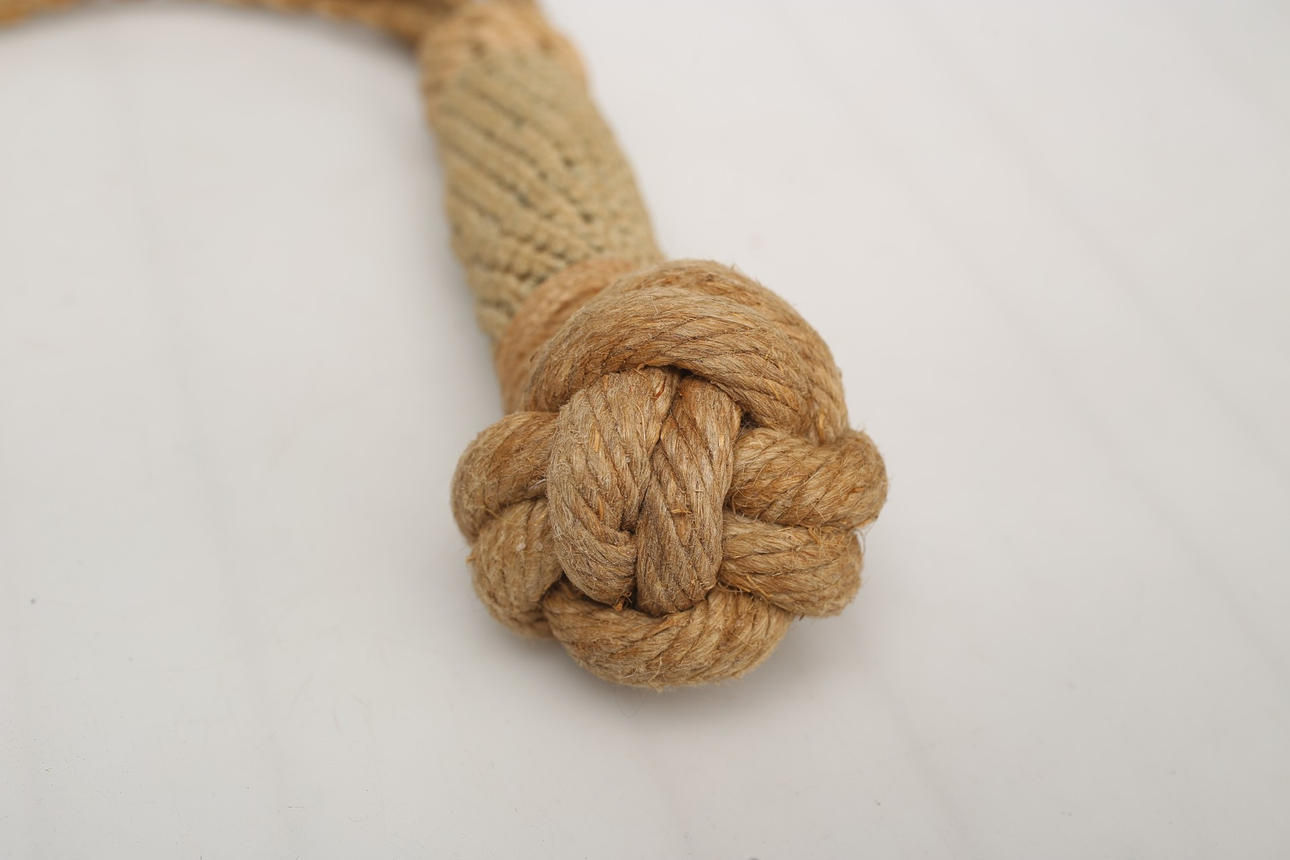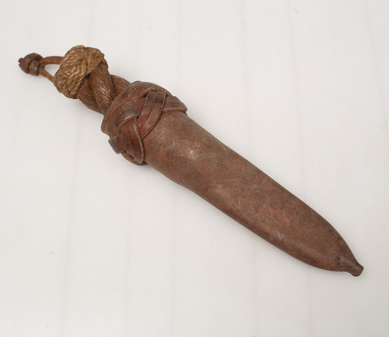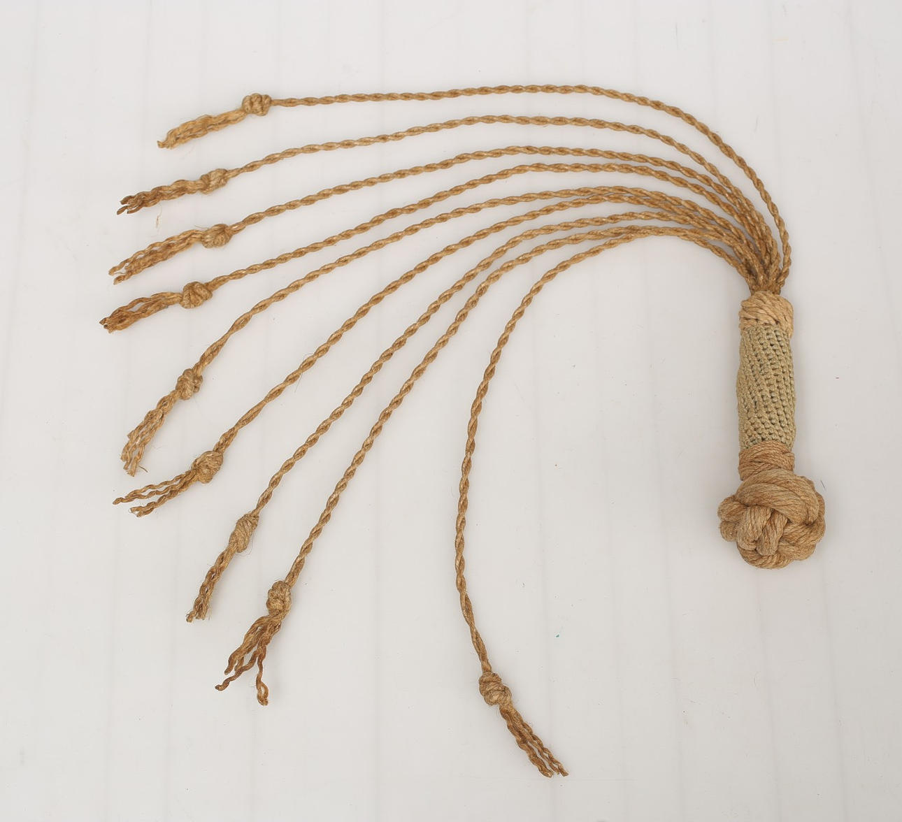 Sjömanshandarbete, kniv med trosshandtag med balja av läder. Knutpiska med 9 armar.