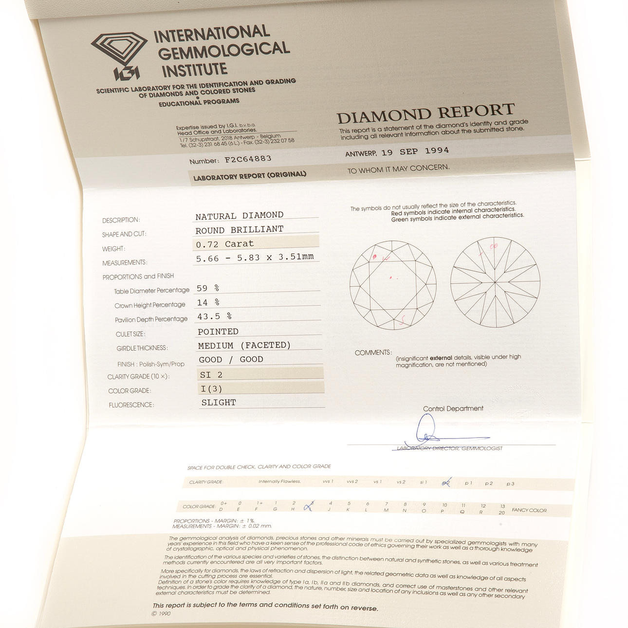 0.72 ct, kvalitet I/SI2 enligt certifikat från International