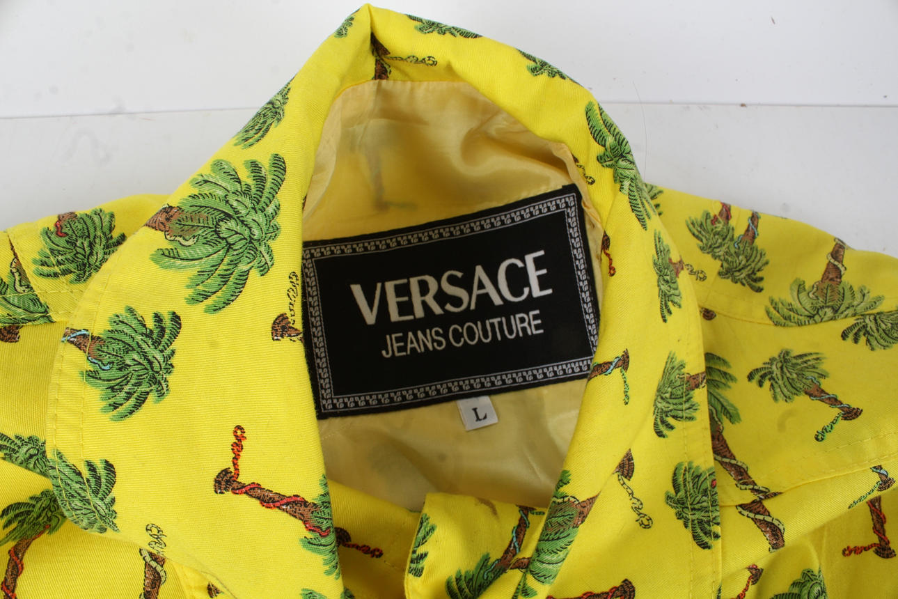 En Versace Jeans Couture-jacka, märkt, gul botten med heltäckande palmträdmotiv, sex centrala knappar inklusive två med gjutna Medusa-huvuden, två mindre till båda manschetterna, storlek stor.