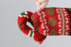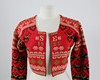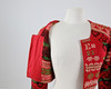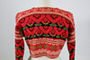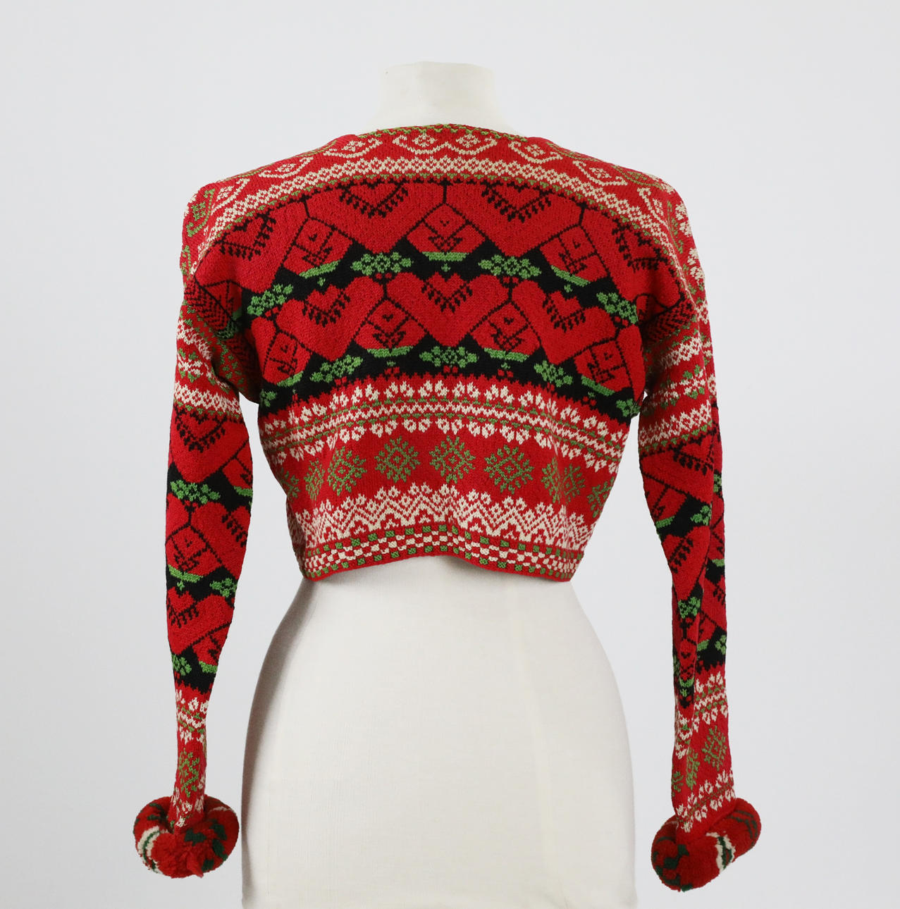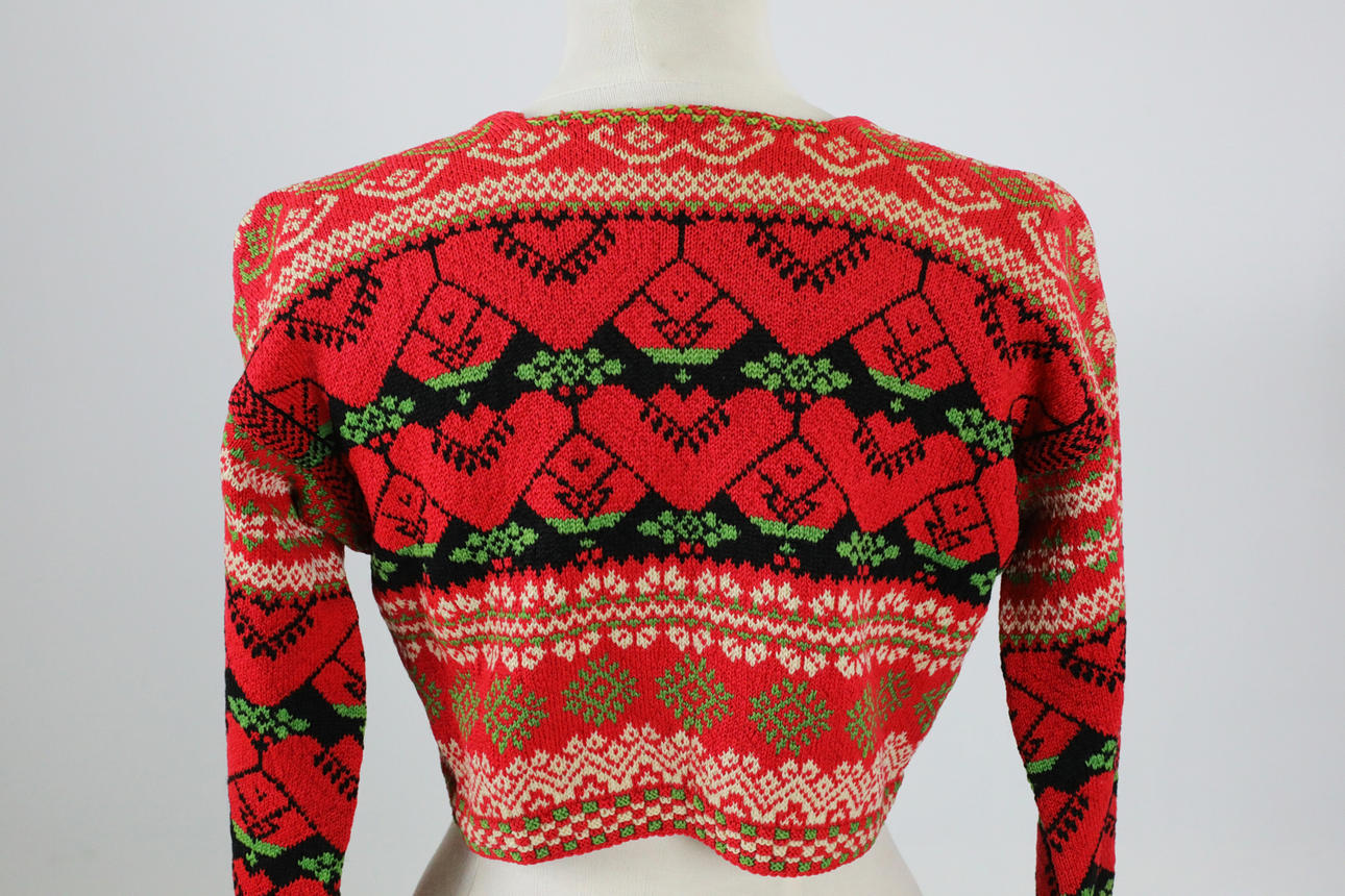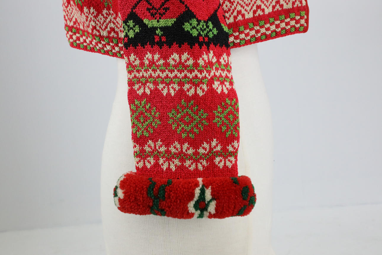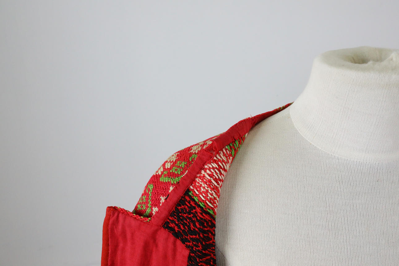 Handstickad. Ullgarn, fodrade kanter med bomull. Ägarinitialer och datering 1932. Flossade valkar i armslut.