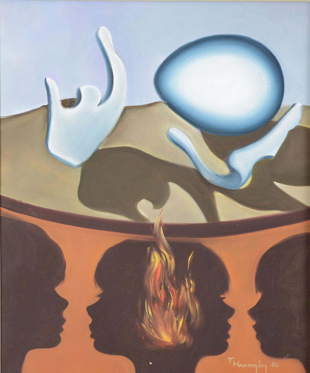 Surrealistisk komposition med ansikten. Signerad och daterad -80. 55x46 cm.