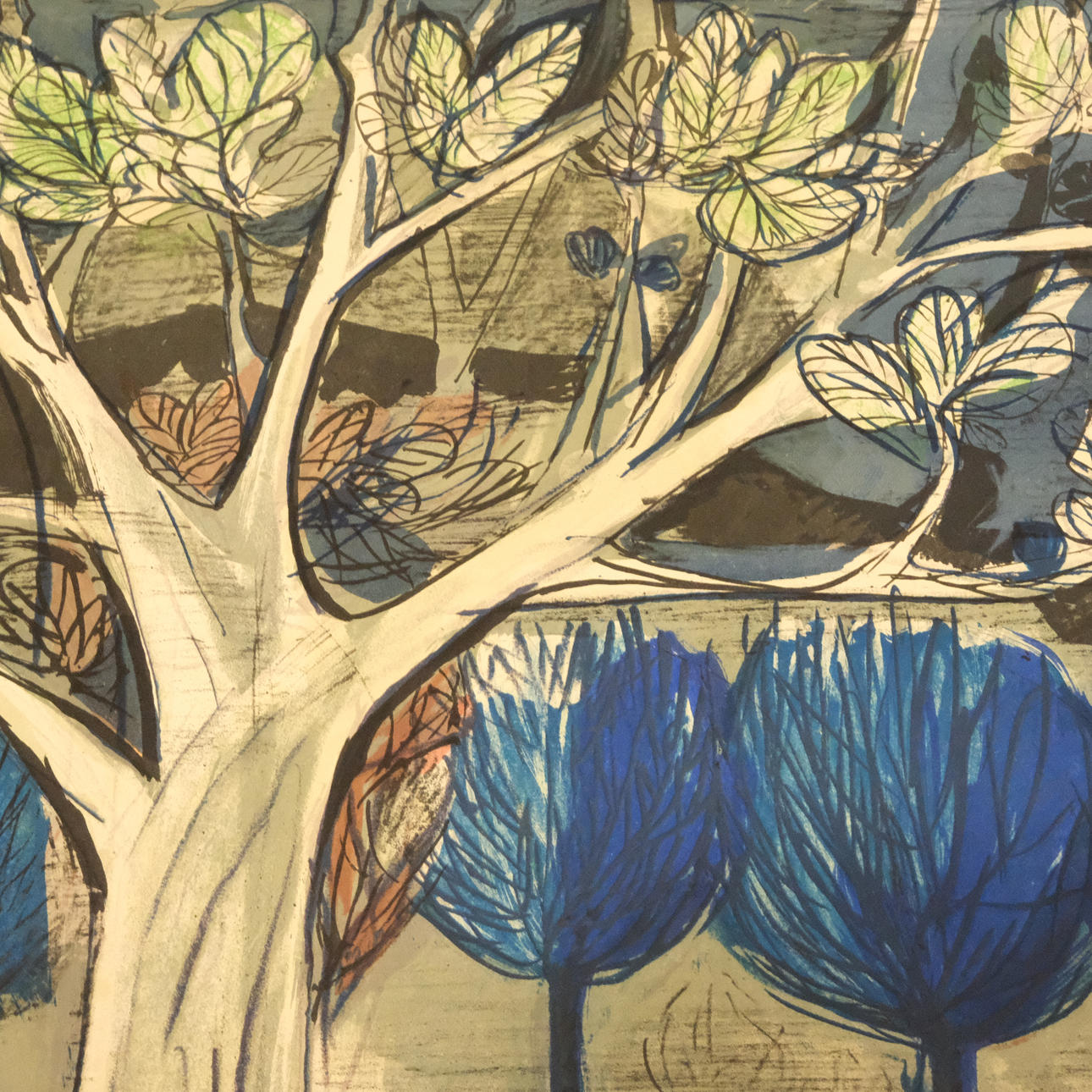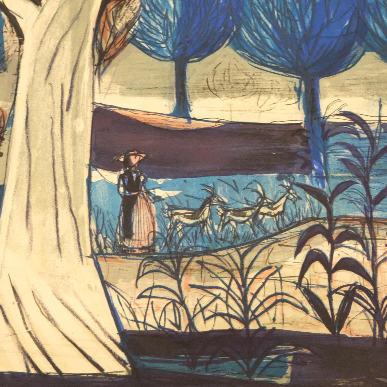 Lantligt skogsmotiv. Signerad, daterad 1956 och numrerad 109/260. Bildmått: ca 62 x 47,5 cm. Bladmått: ca 70 x 54,5 cm.