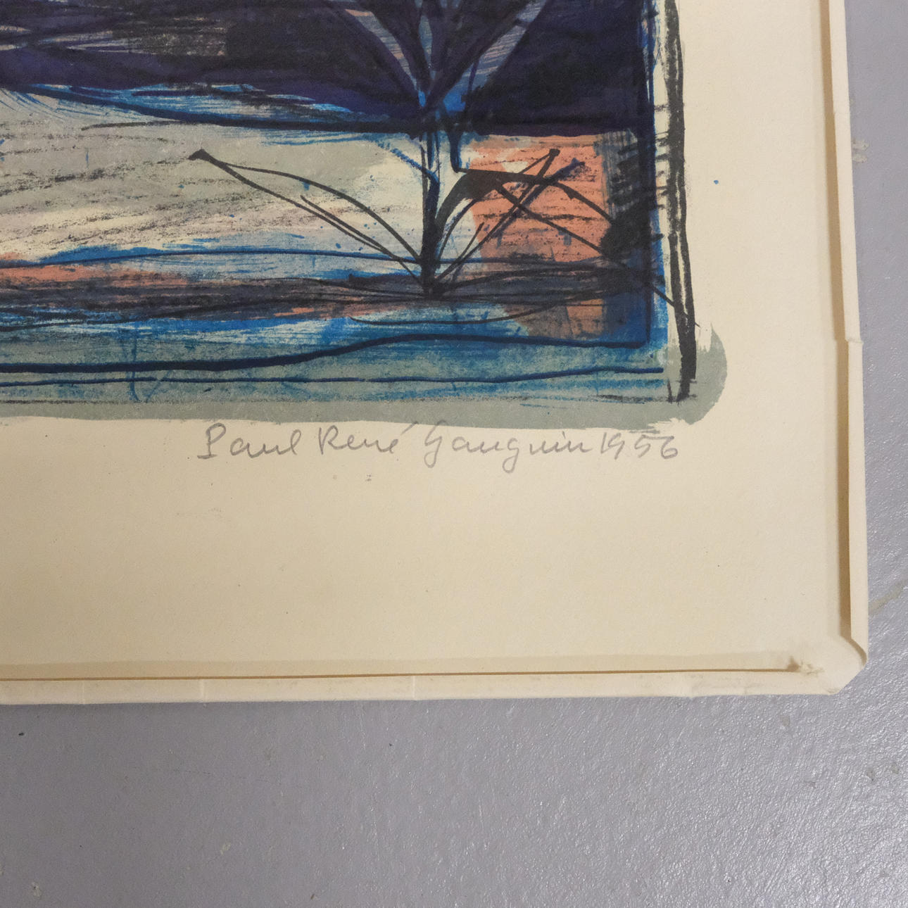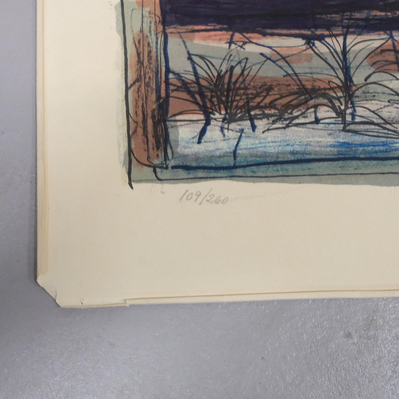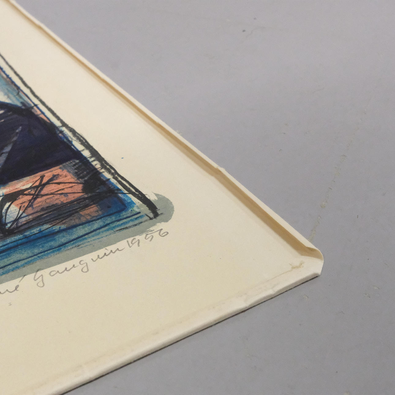 Blad med uppvikta kanter med revor. Ej inrammad.