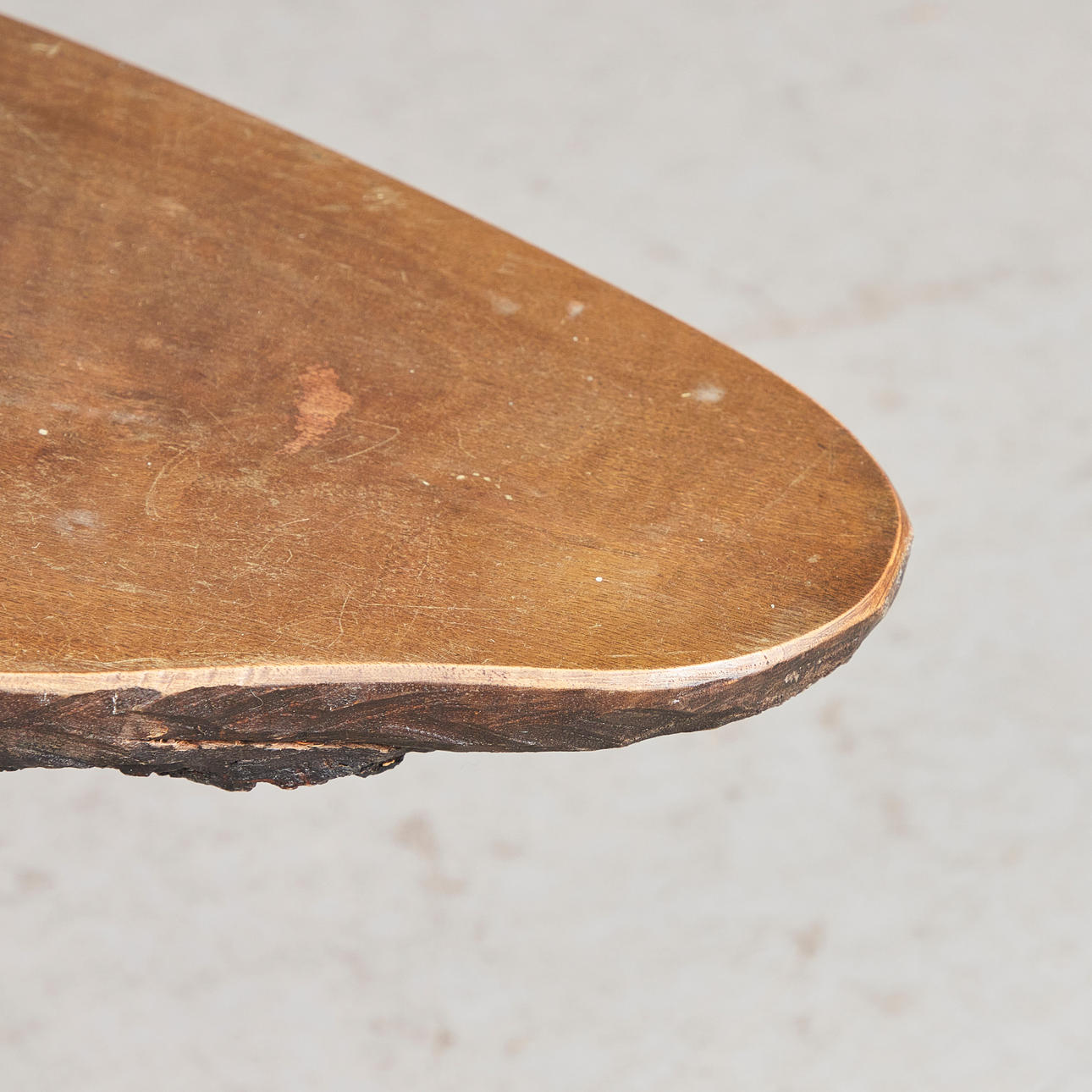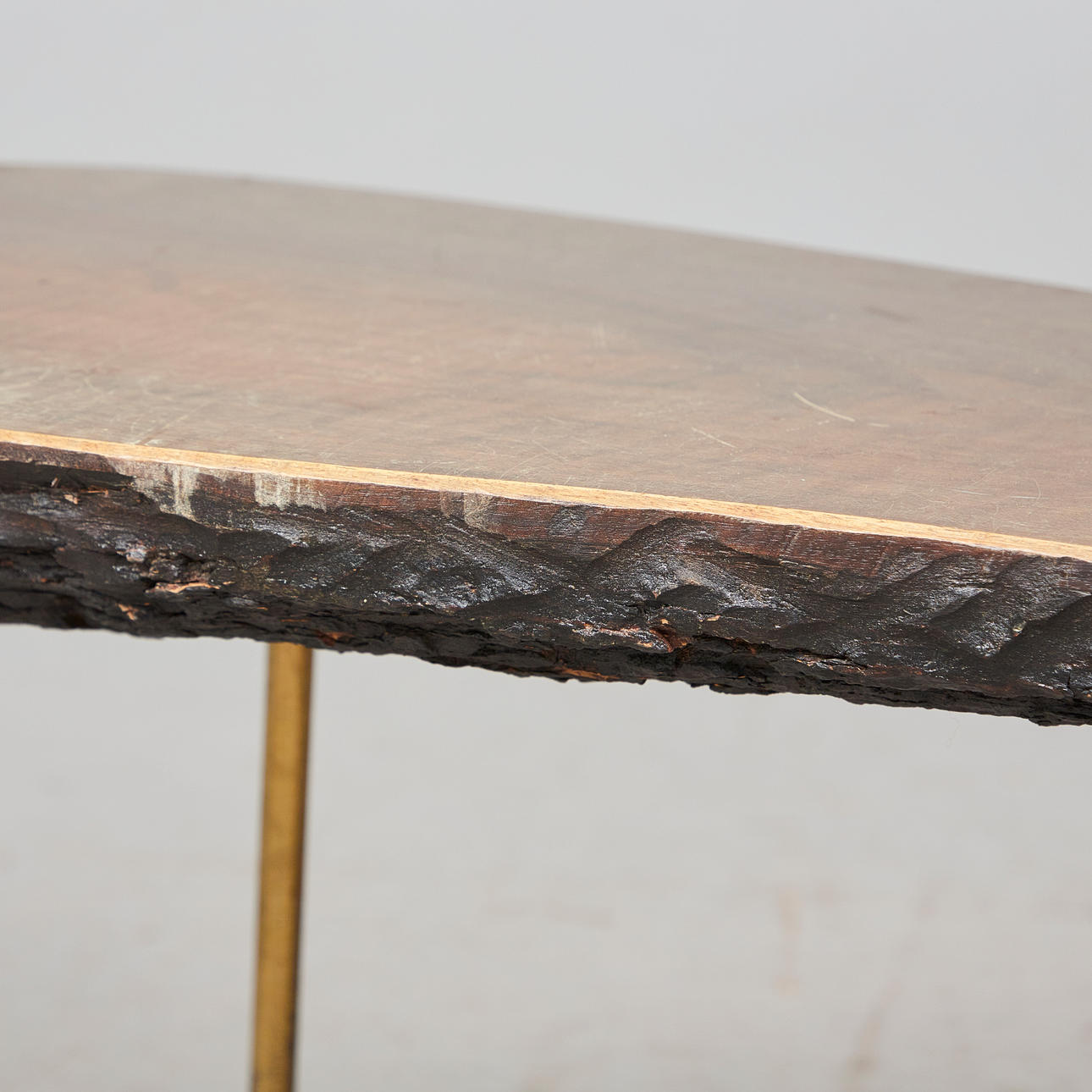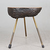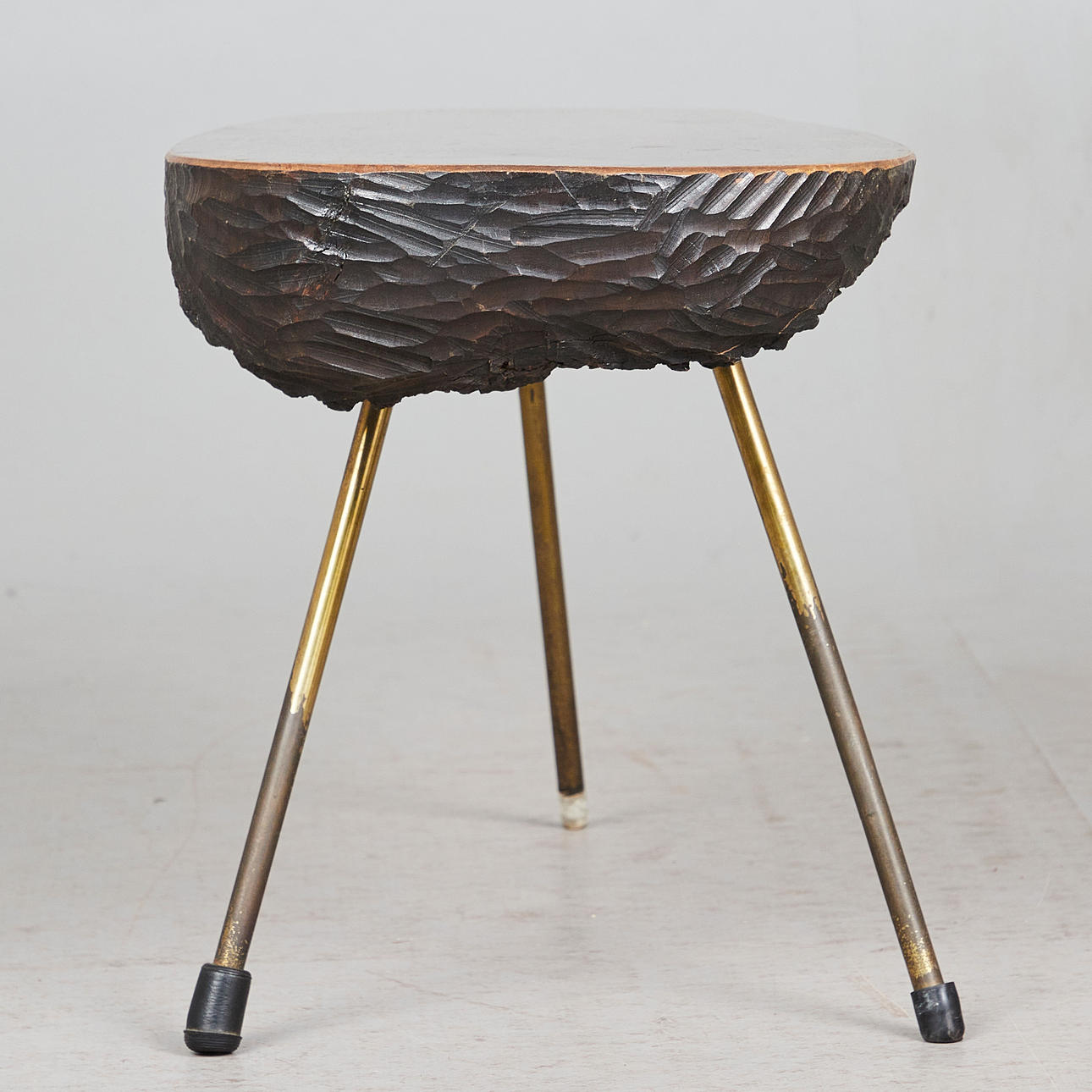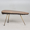 Soffbord/sidobord, valnöt, mässing, 1960-tal. Sidobord med tre upphöjda mässingsben och en tjockväggig, organiskt formad bordsskiva i glaserat valnötsträ, försedd med svarta plastskydd, H.43cm, L.97cm, W.38cm.