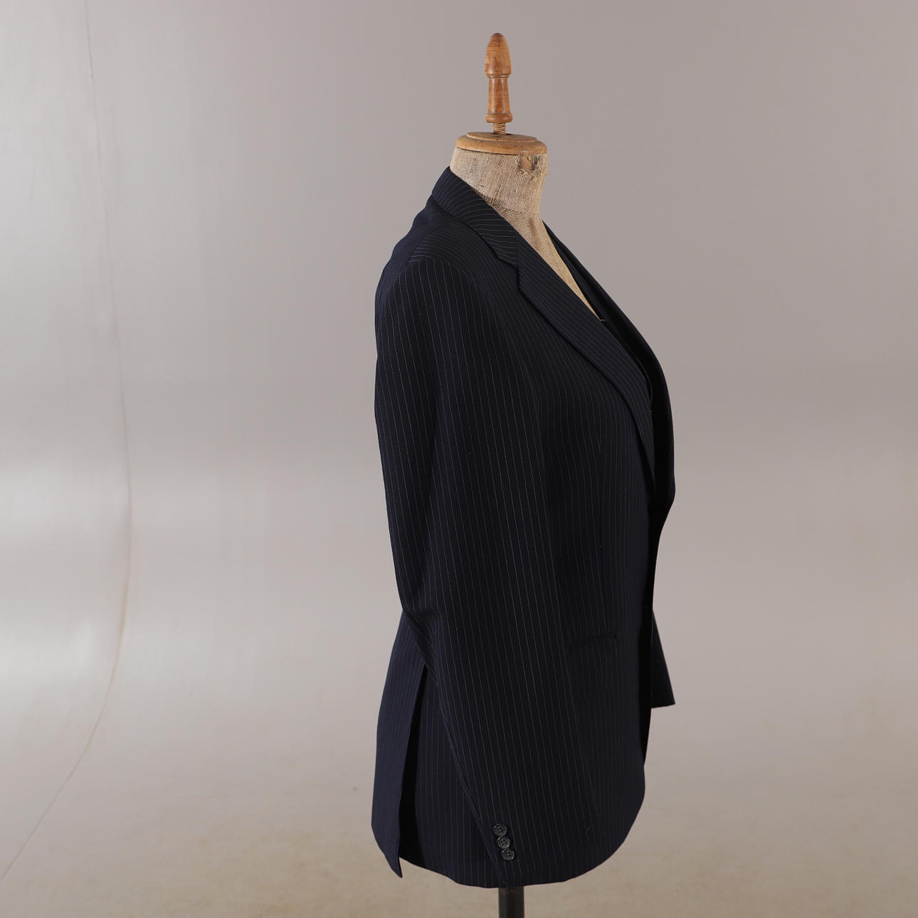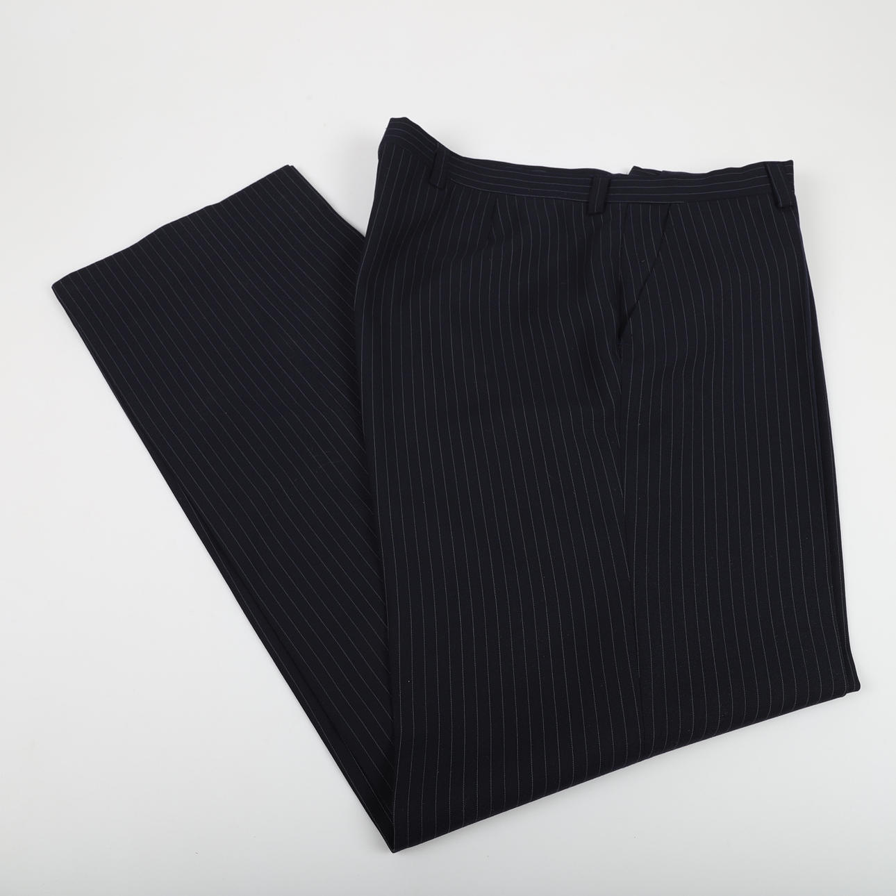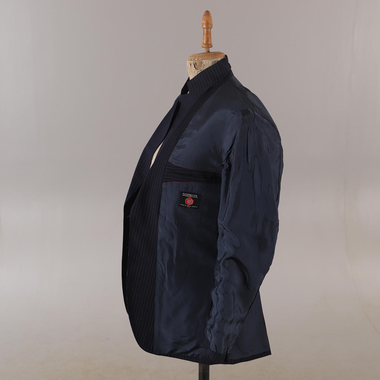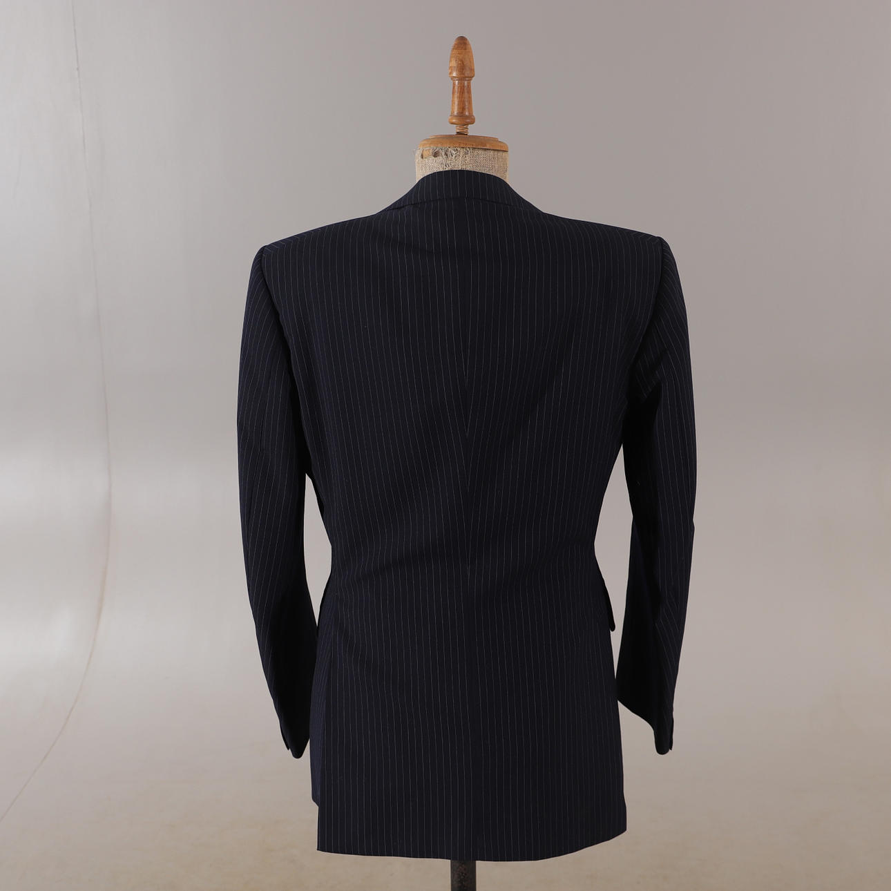 Mörkblå, kritstrecksrandig kostym Kavaj, ryggmått 78, ärminnerlängd 50 cm Väst, rygglängd 56 cm Byxor, längd 107, beninnerlängd 83 cm.