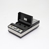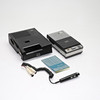 Med väska och mikrofon. Väskans bredd ca 17,5. Längd ca 21. Höjd ca 6,5 cm.