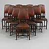 10 stolar, 2 karmstolar. Skänk, längd 164, bredd 60, höjd 102cm. Bord längd 149, bredd 120, höjd 77 cm samt 2 utdragbara iläggskivor, längd 58 cm. Något olika stil på stolar.