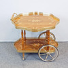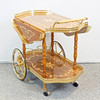 Två hyllplan med laminat, övre med 2 utfällbara klaffar, nedre med ställ för tre flaskor. Detaljer i gulmetall. På hjul.