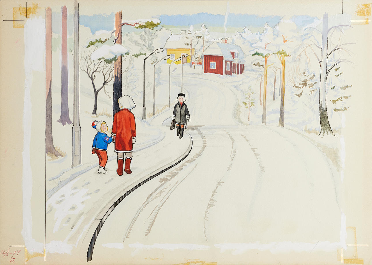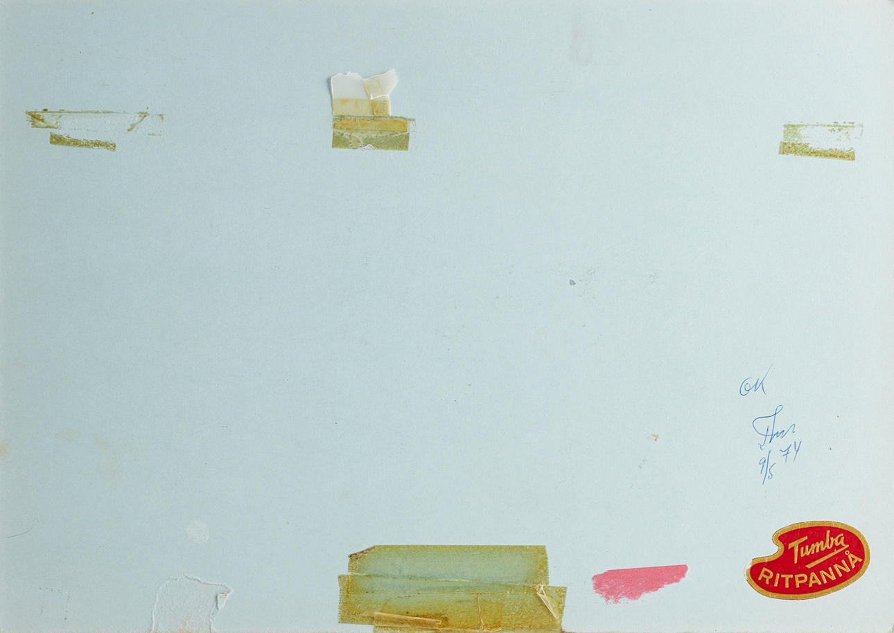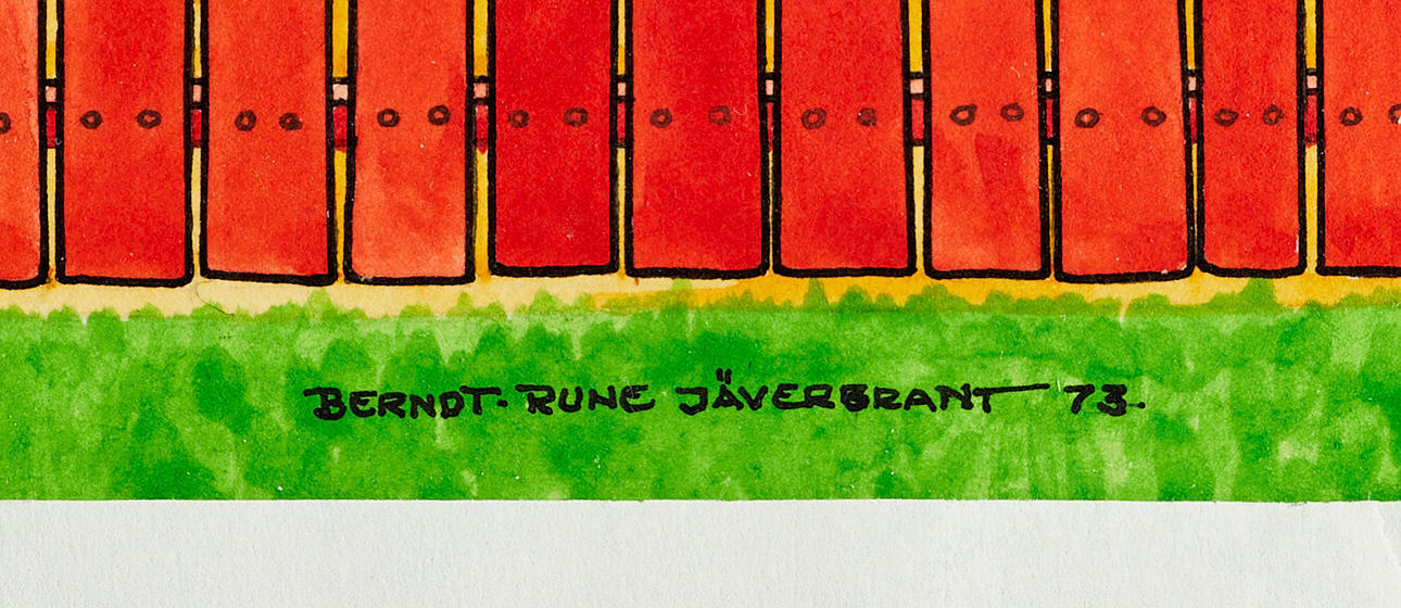 4 förlagor i gouche, ca 21x30cm vardera, kartongstorlek 25x35cm. Signatur med datering 1973/74 a tergo.