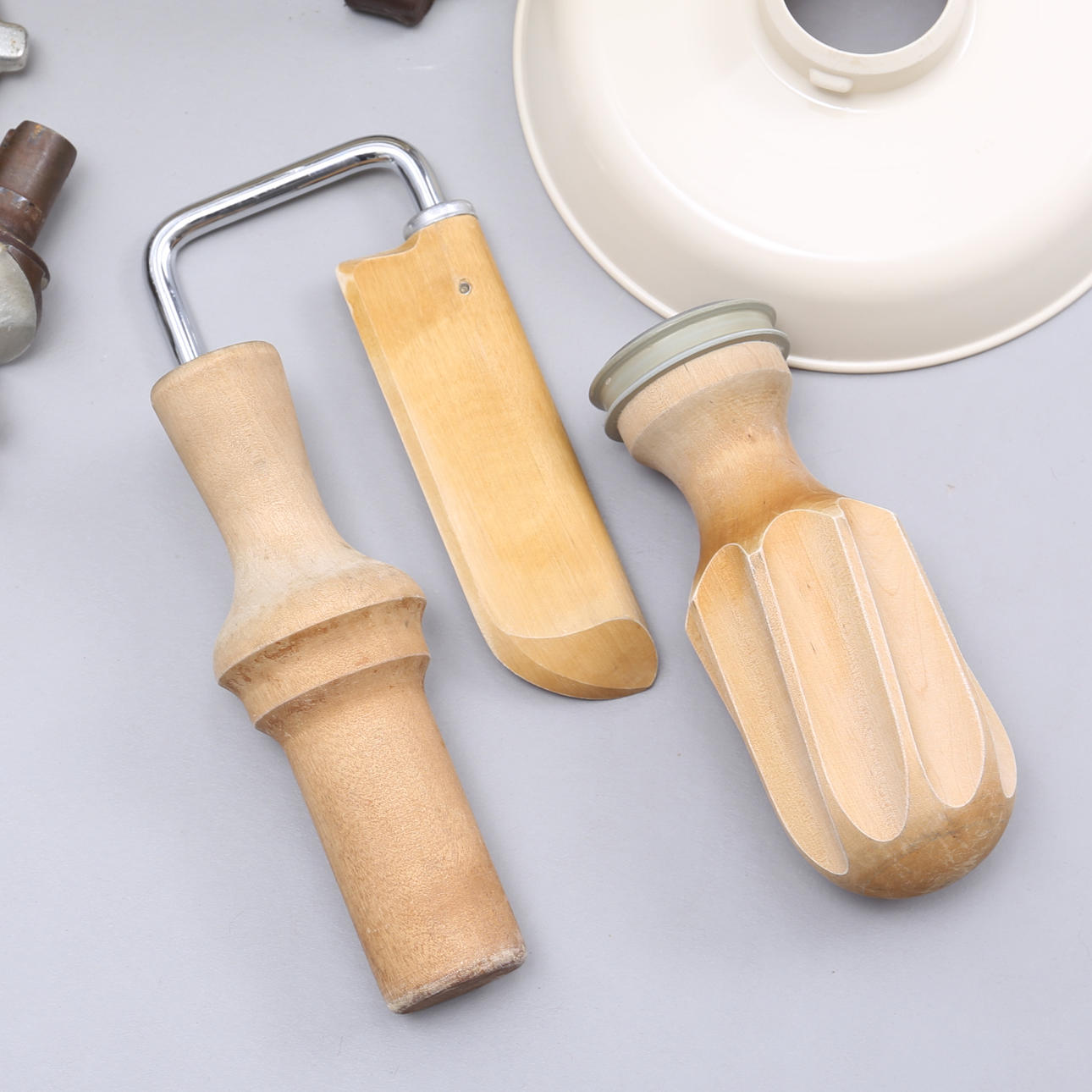 Hushållsassistent med redskap av trä. Köttkvarn medföljer.