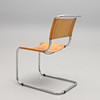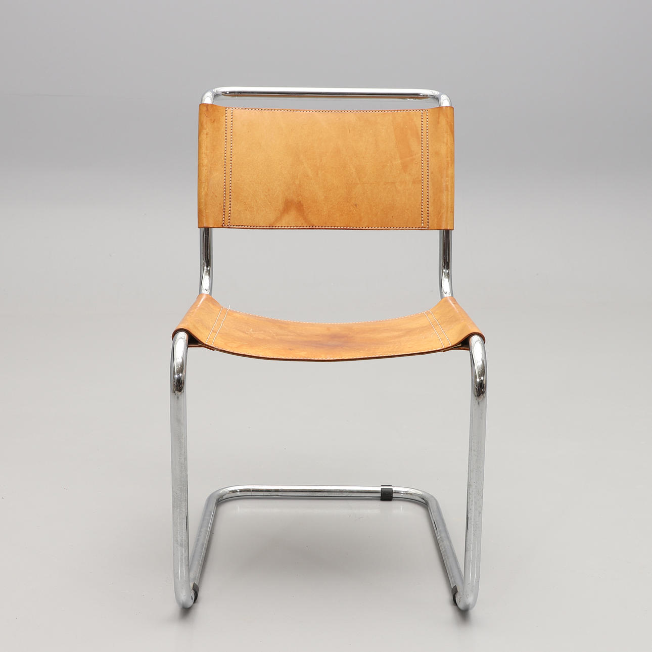 Kromad stålrörsstomme, sits och rygg i cognacsfärgat läder. Bredd 49, höjd 43 cm.