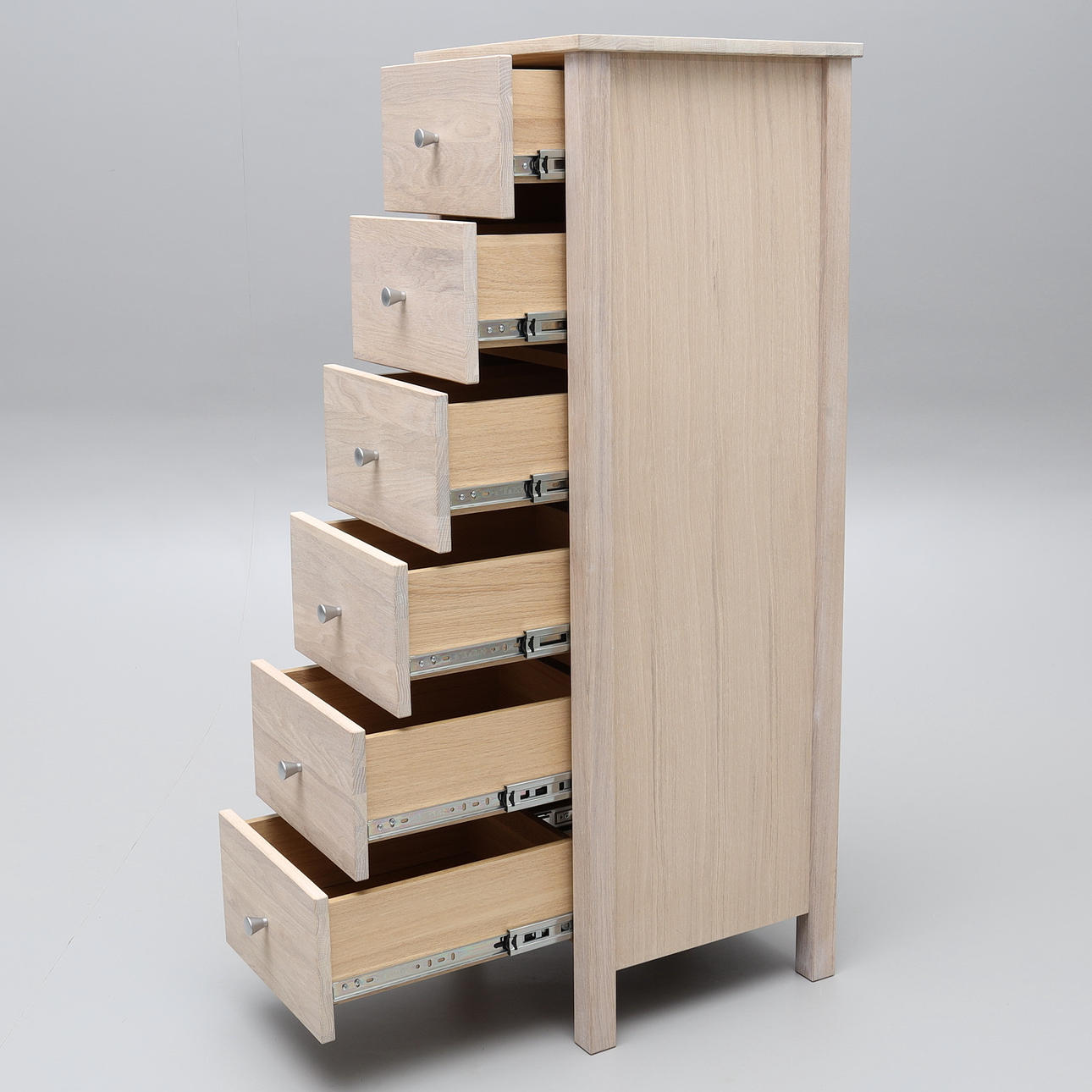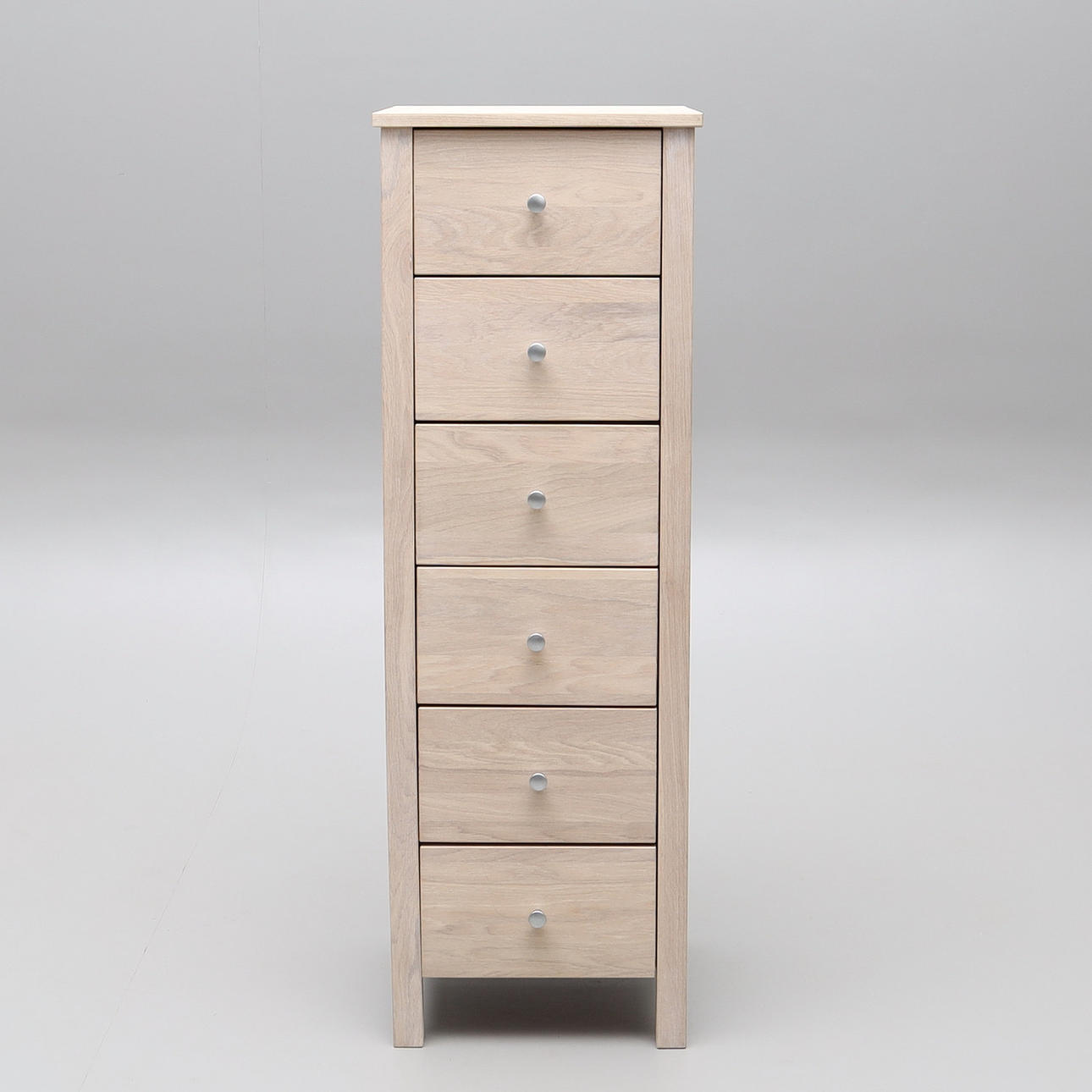 Byrån är från Möblemästarnas egen kollektion och heter Åre. Finns fortfarande i produktion. Byrån har lådor med dämpande funktion och som stänger mjukt.