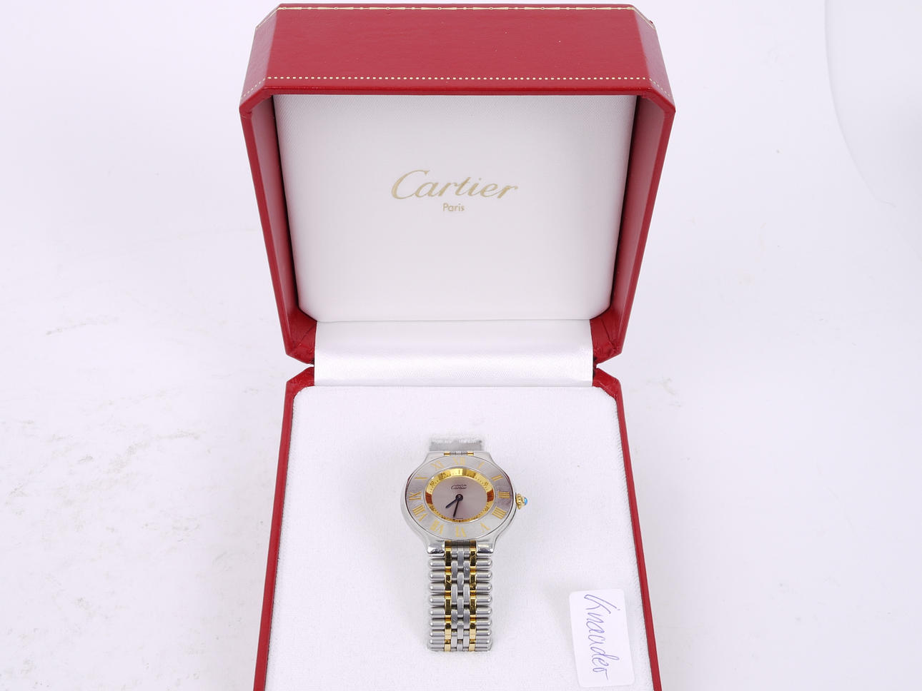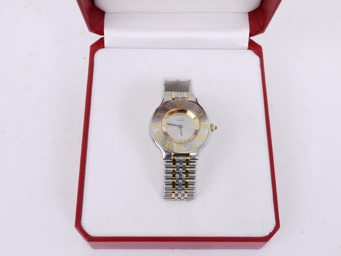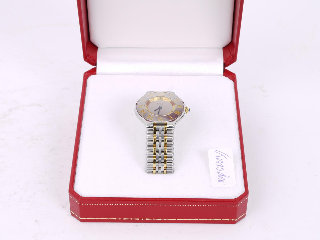 Den erbjudna Cartier Must 21 är i gott skick med partiella tecken på slitage på stålfodralet och armbandet.