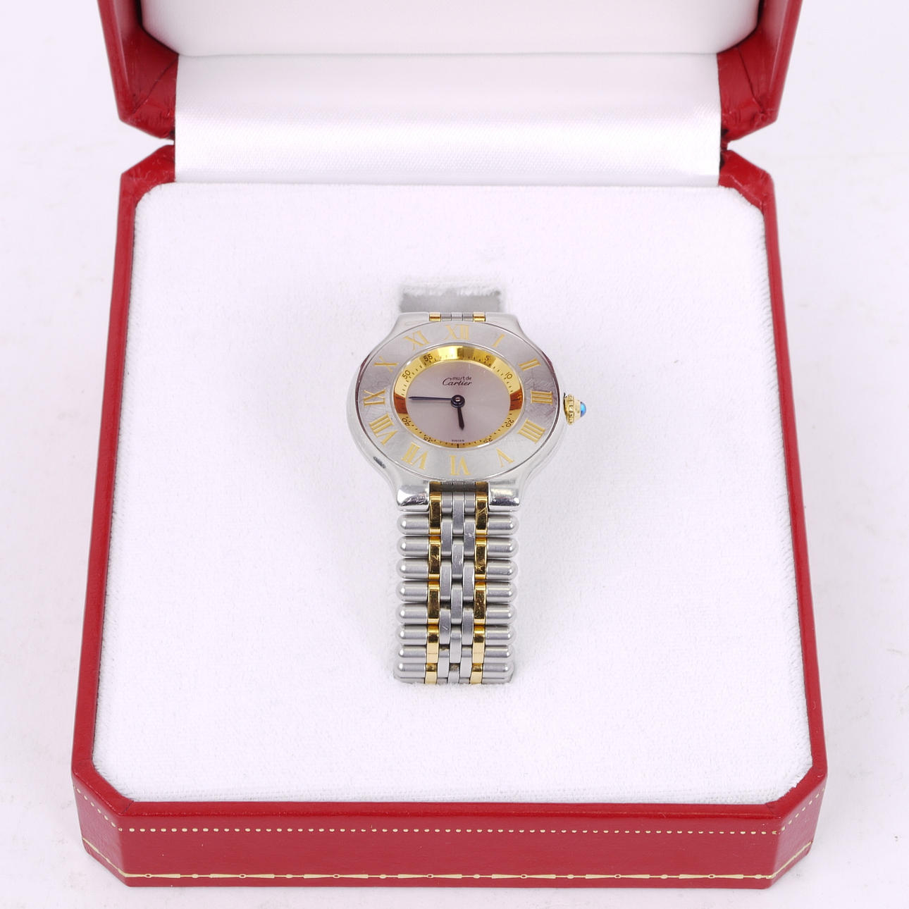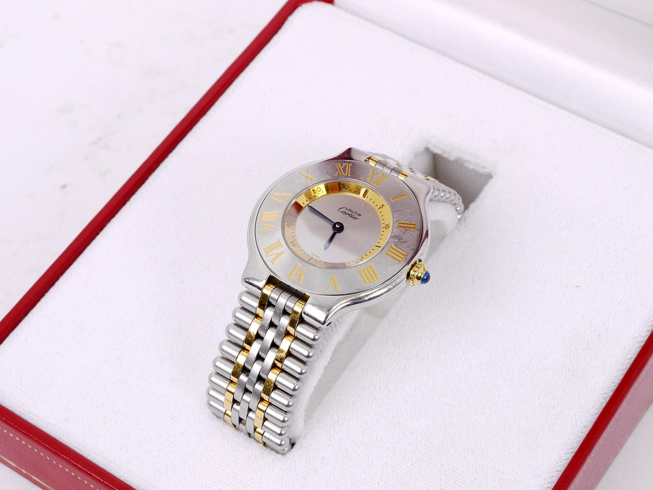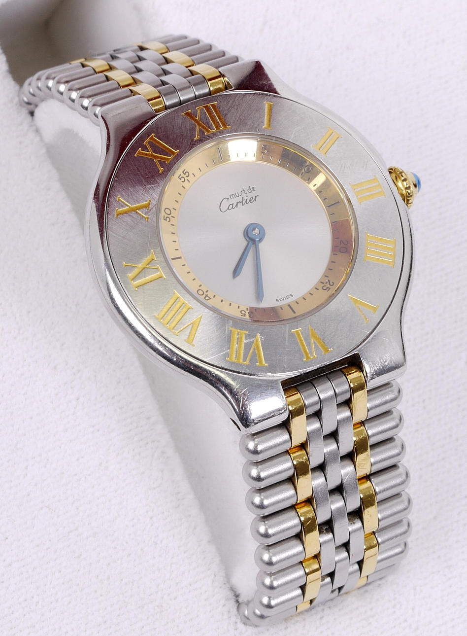 Den erbjudna Cartier Must 21 är i gott skick med partiella tecken på slitage på stålfodralet och armbandet.