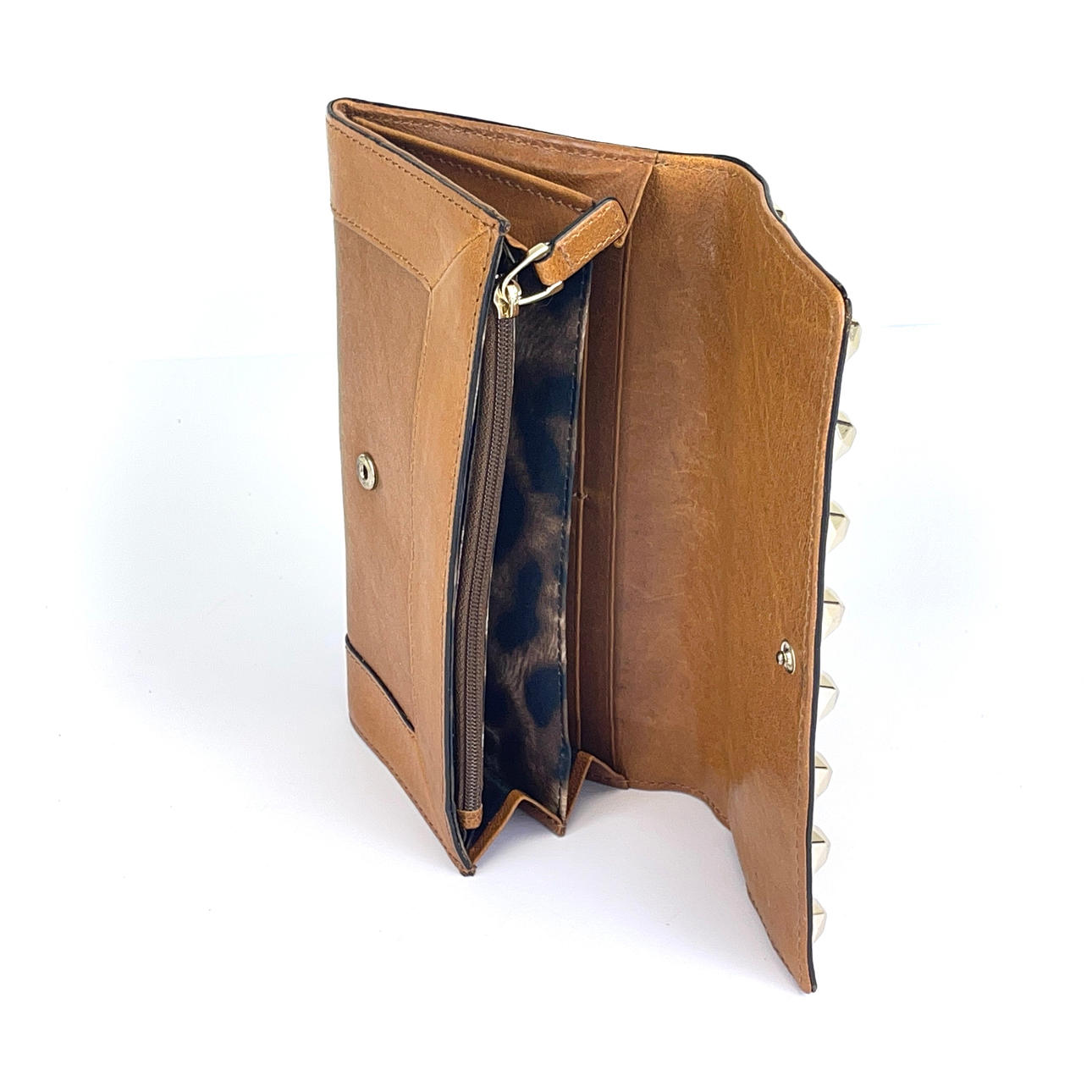 Kvinnors Karen Millen brun läderplånbok med metallstrålar på klaffen. Längd 19cm., Bredd 11cm., Djup 3cm.