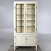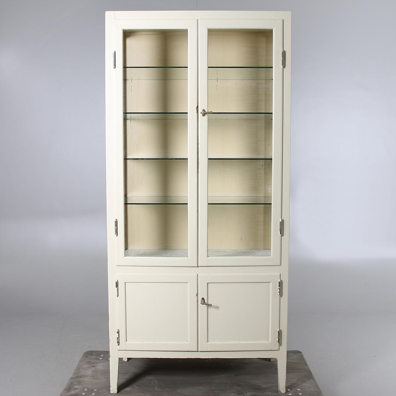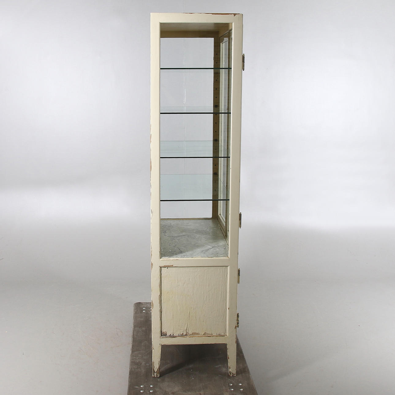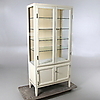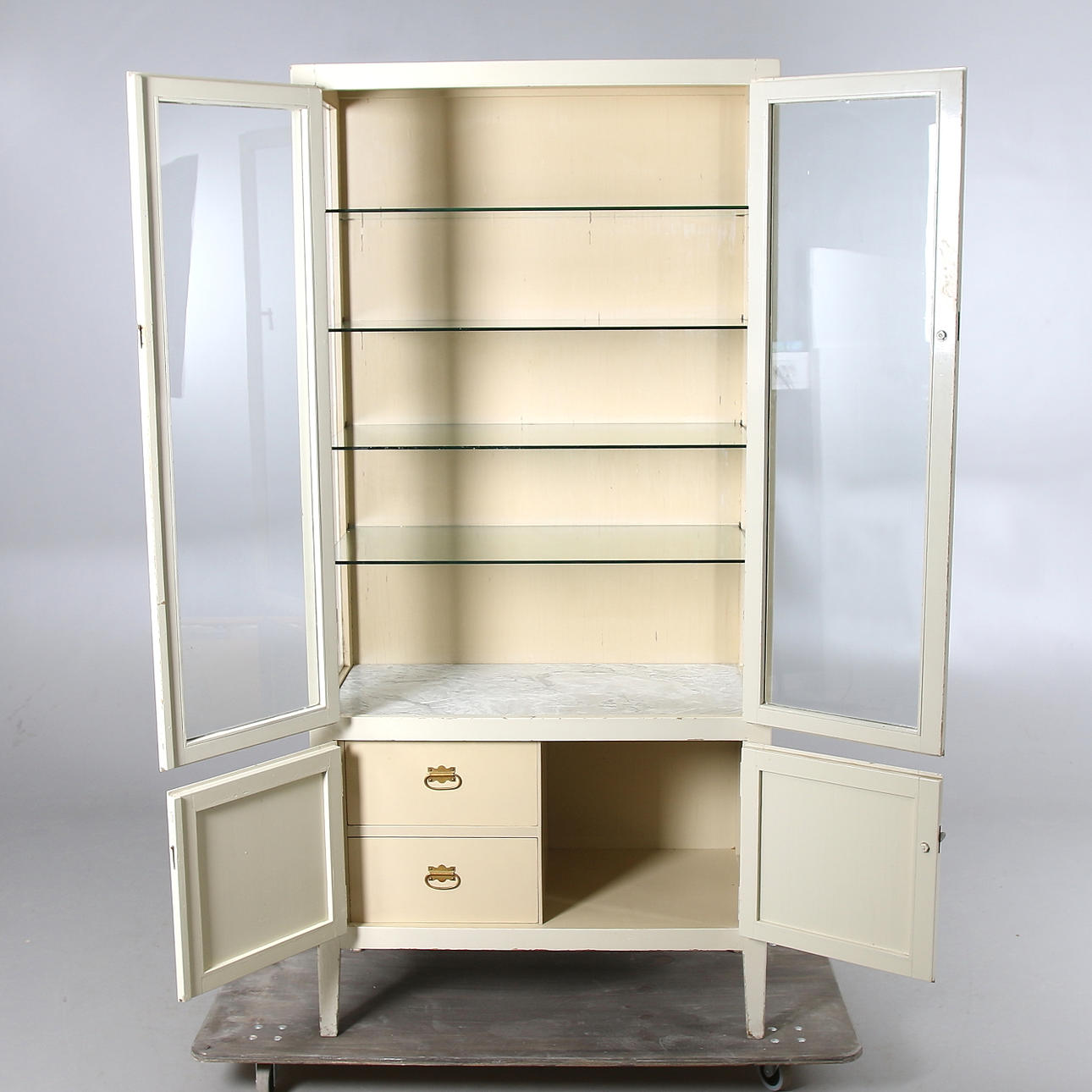 Trä. Senare bemålad, hyllplan av glas. Underskåp med bakomliggande lådor. Bredd 81, djup 41, höjd 170 cm.