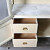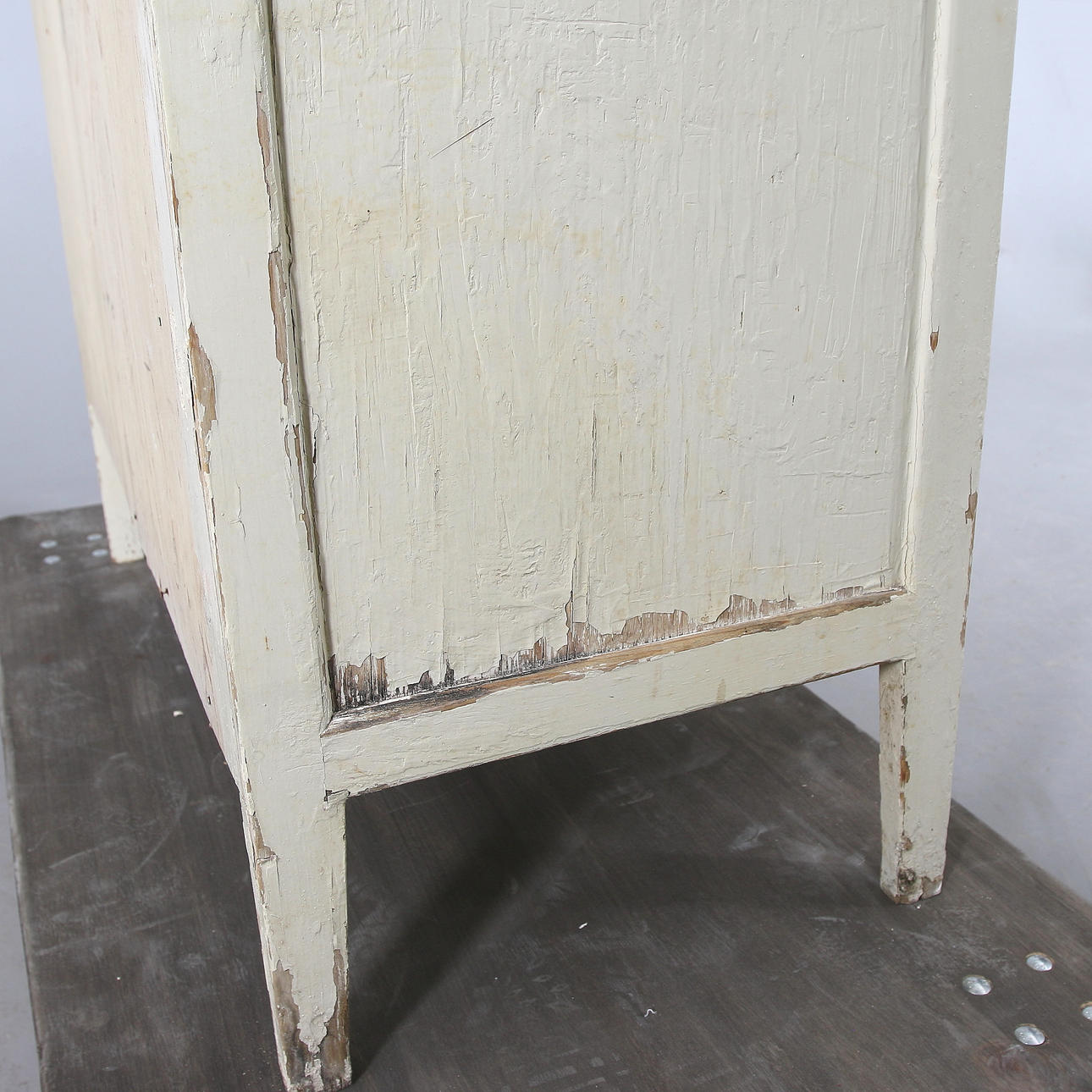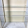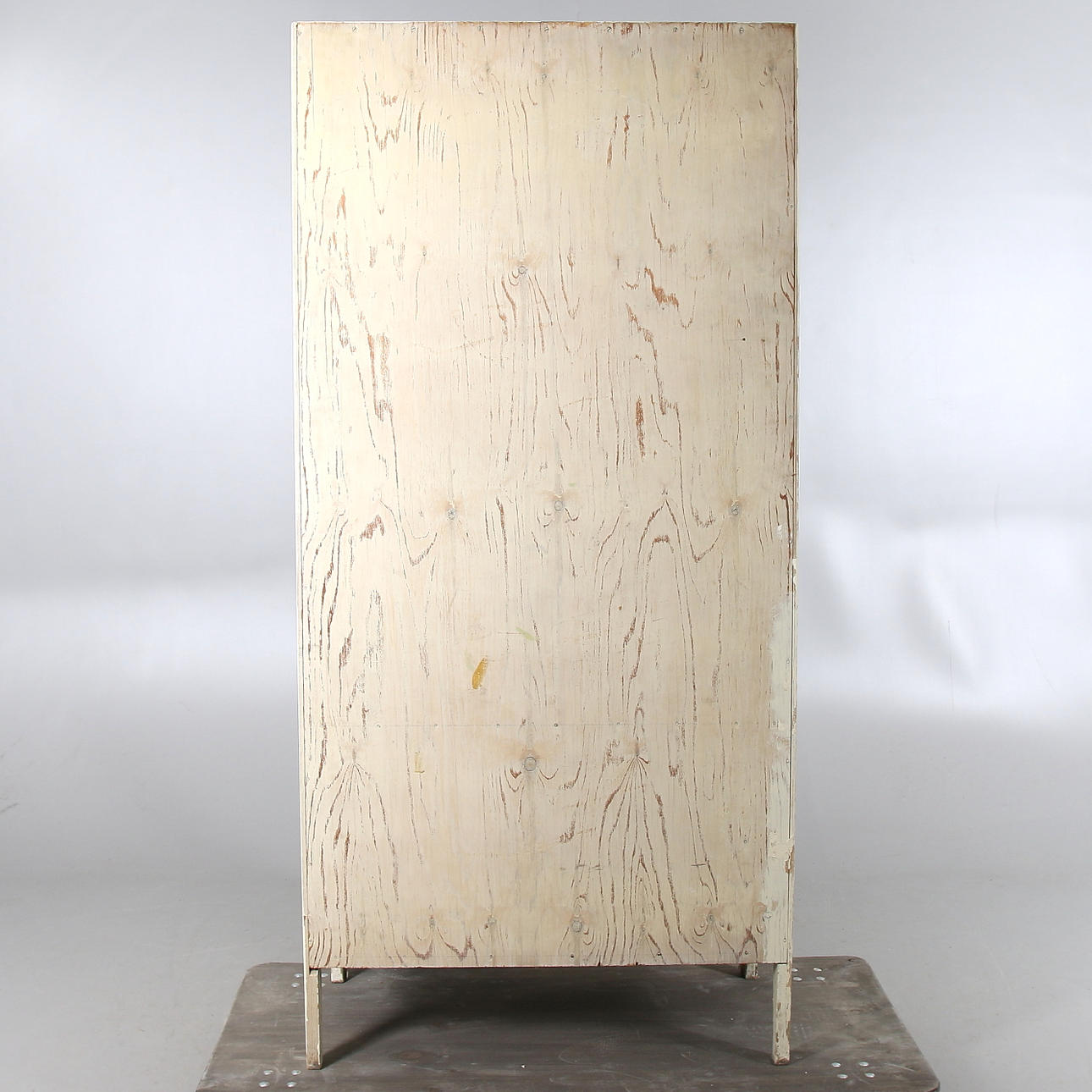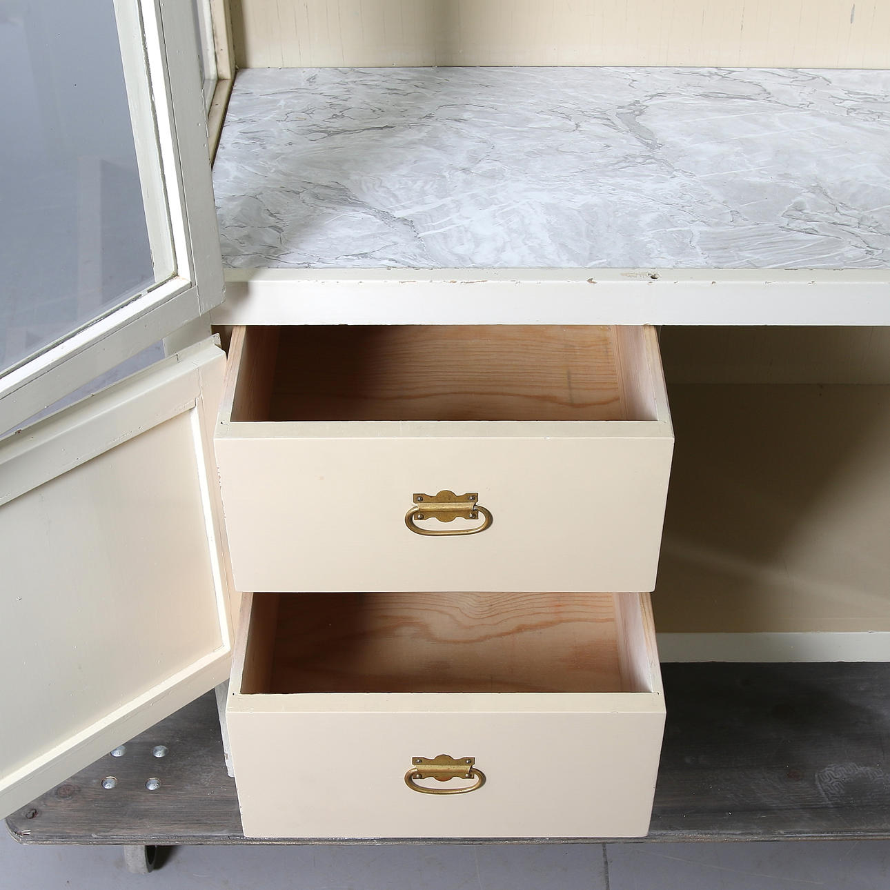 Trä. Senare bemålad, hyllplan av glas. Underskåp med bakomliggande lådor. Bredd 81, djup 41, höjd 170 cm.