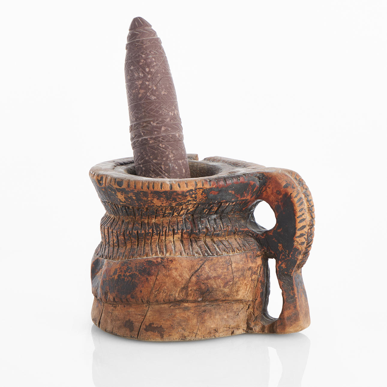 Mortel med etikett "Ink.pt i Marmaris Turkiet 1963". Morteln höjd 13. Stenmortel med ristad dekor, längd 23cm.