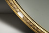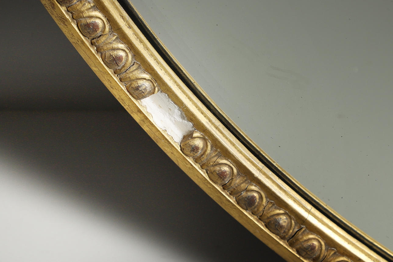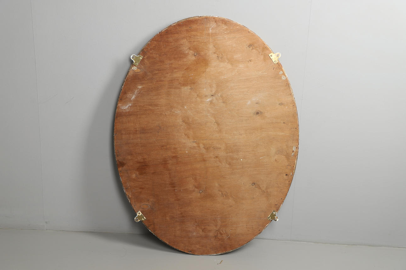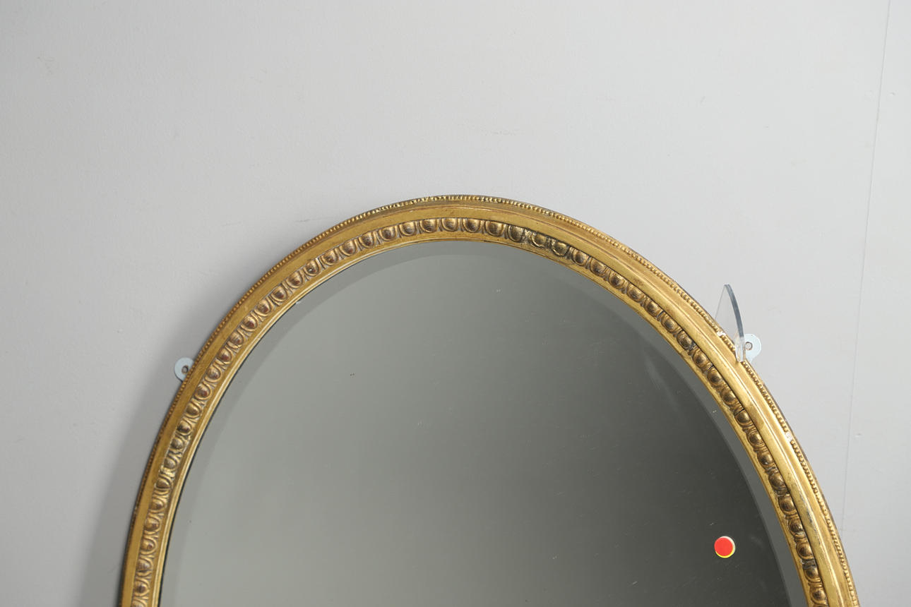 Kan väggmonterad, guldmålade pärlstav dekorativa gips ram. Fasad kant spegelglas. Längd 110cm x Diameter 85cm.