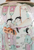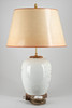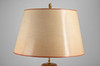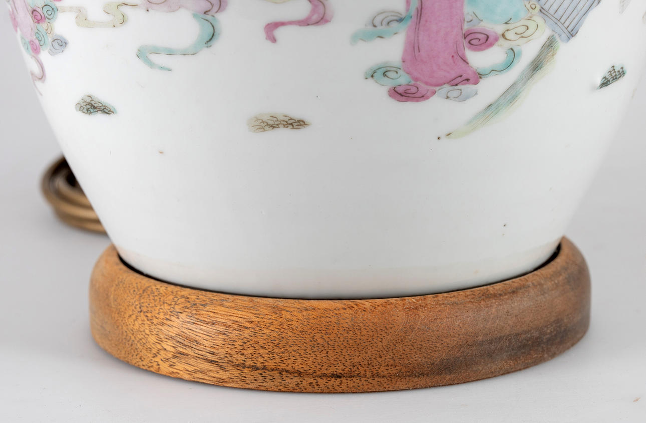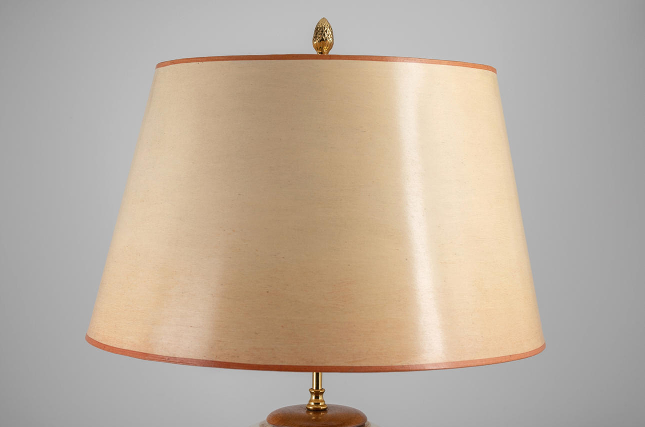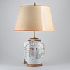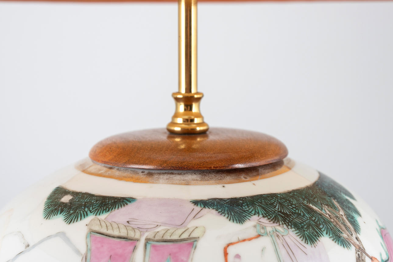 Äggformad lampbas Färgglatt målat stengods Konisk lampskärm Figur scen på framsidan i ett bergslandskap. 2-flamma, senare elektrifierad. HxDm: ca. 26 x 21 cm (vas), höjd ca. 69 cm (totalt).
