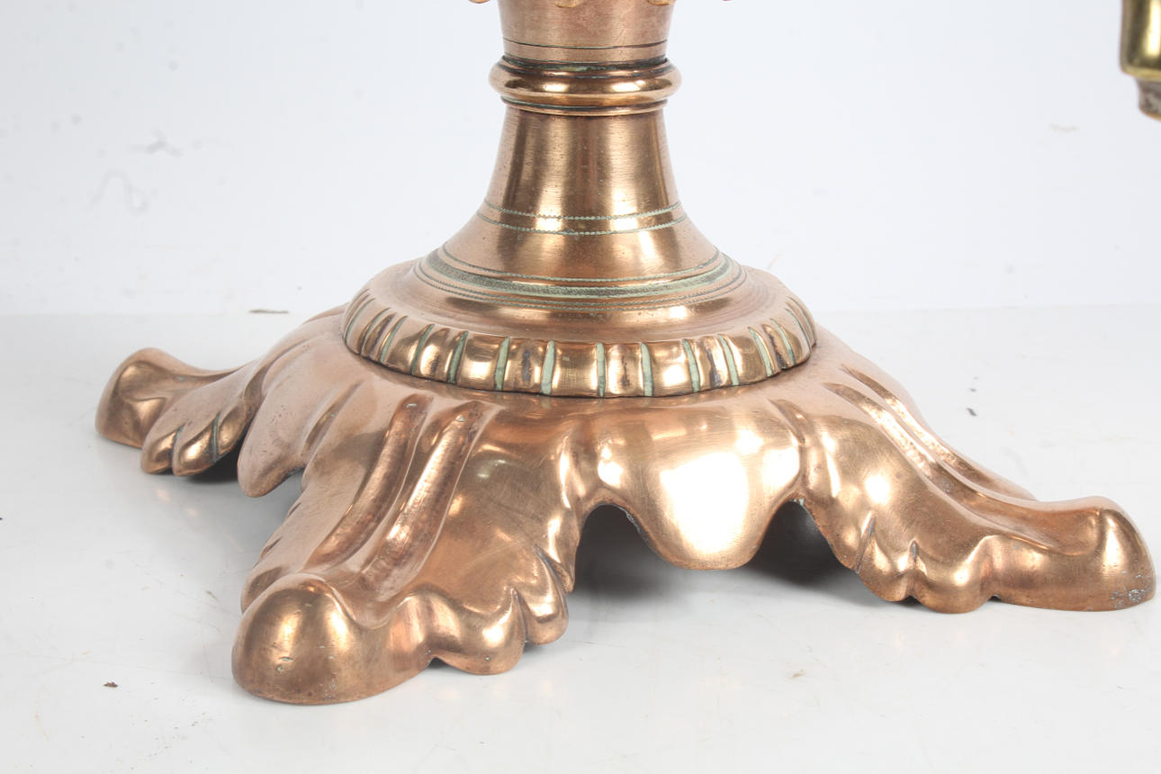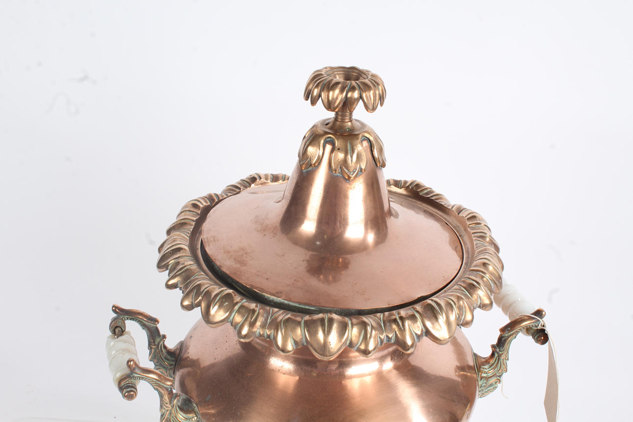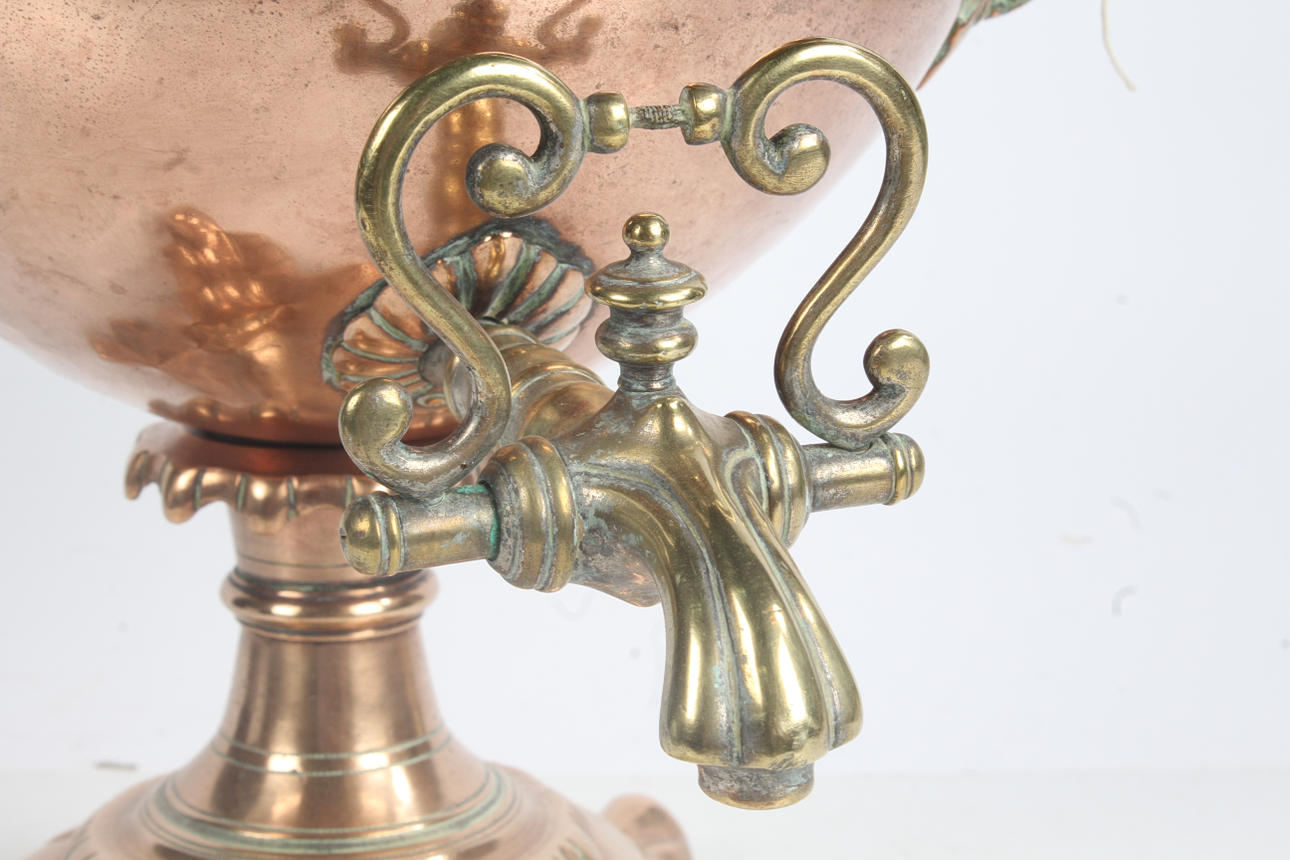 En 1800-tals koppar och mässing Samovar te urna, baring makers namn till undersidan av upplyst? & Burton of Oxford, set med bladdekoration, 50cm hög.