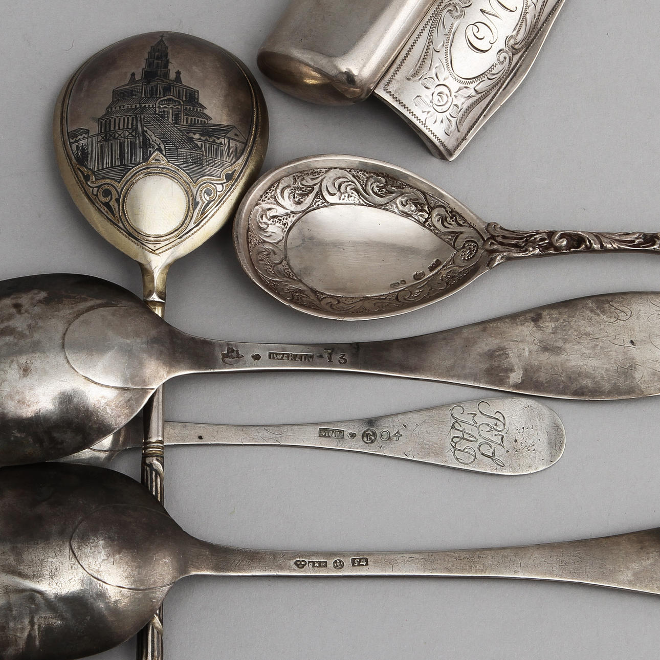 Bl a sked Ryssland med motiv av byggnad i nielloteknik, 3 skedar 1800-tal, dosa, samt sked.