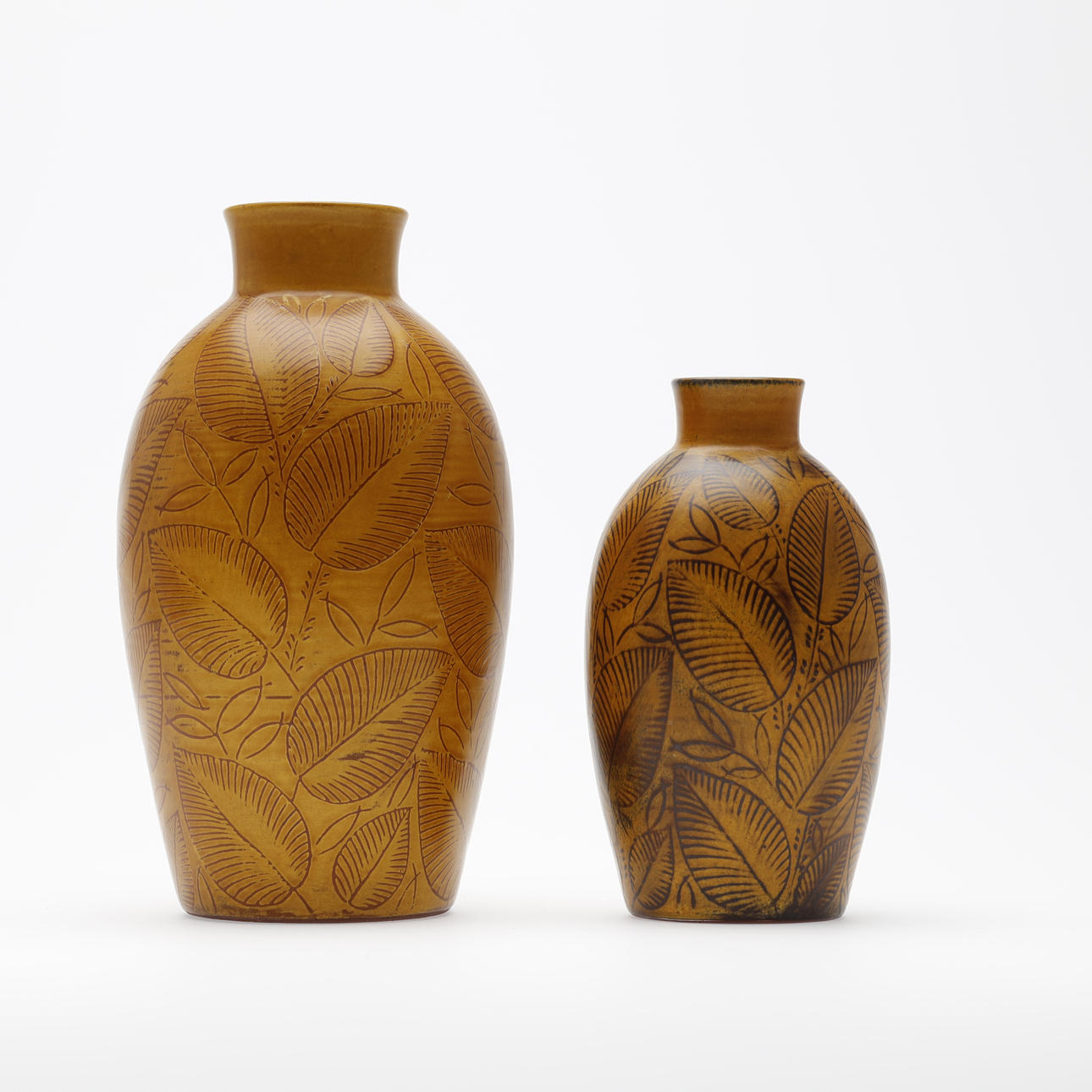 Vaser, 2 st av Nils Thorsson (1898-1975) ur serien ”Løvspring”, tillverkade på Royal Copenhagen. Höjd: 15-20 cm. Diameter: 7,5-11,5 cm.
