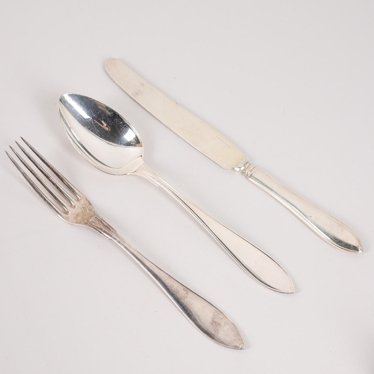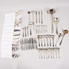 Sås slev 1 st. Soppslev 1 st. serveringsgafflar 3 st. fruktknivar 12 st. fruktgafflar 7 st. såssil 1 st. kakspatel 2 st. Olika skedar 3 st. mindre gafflar 3 st.