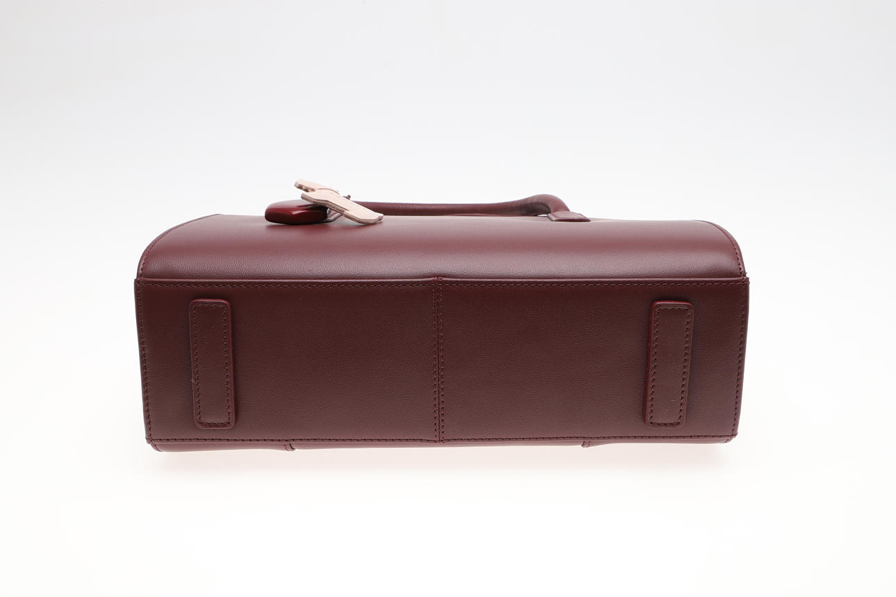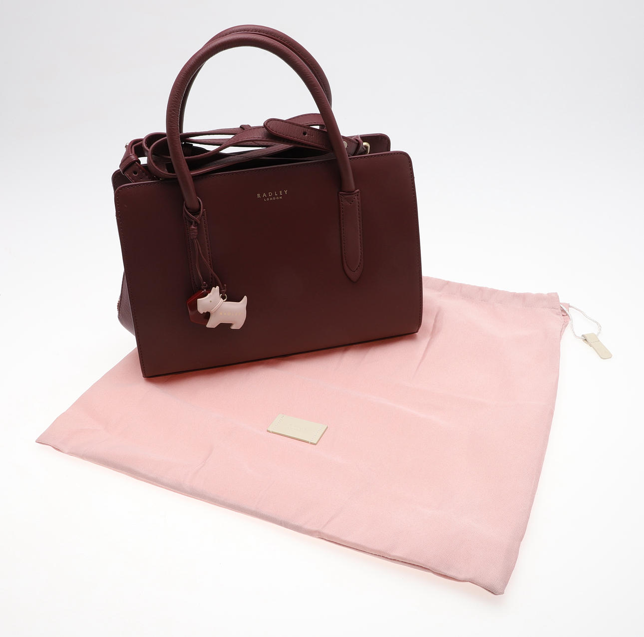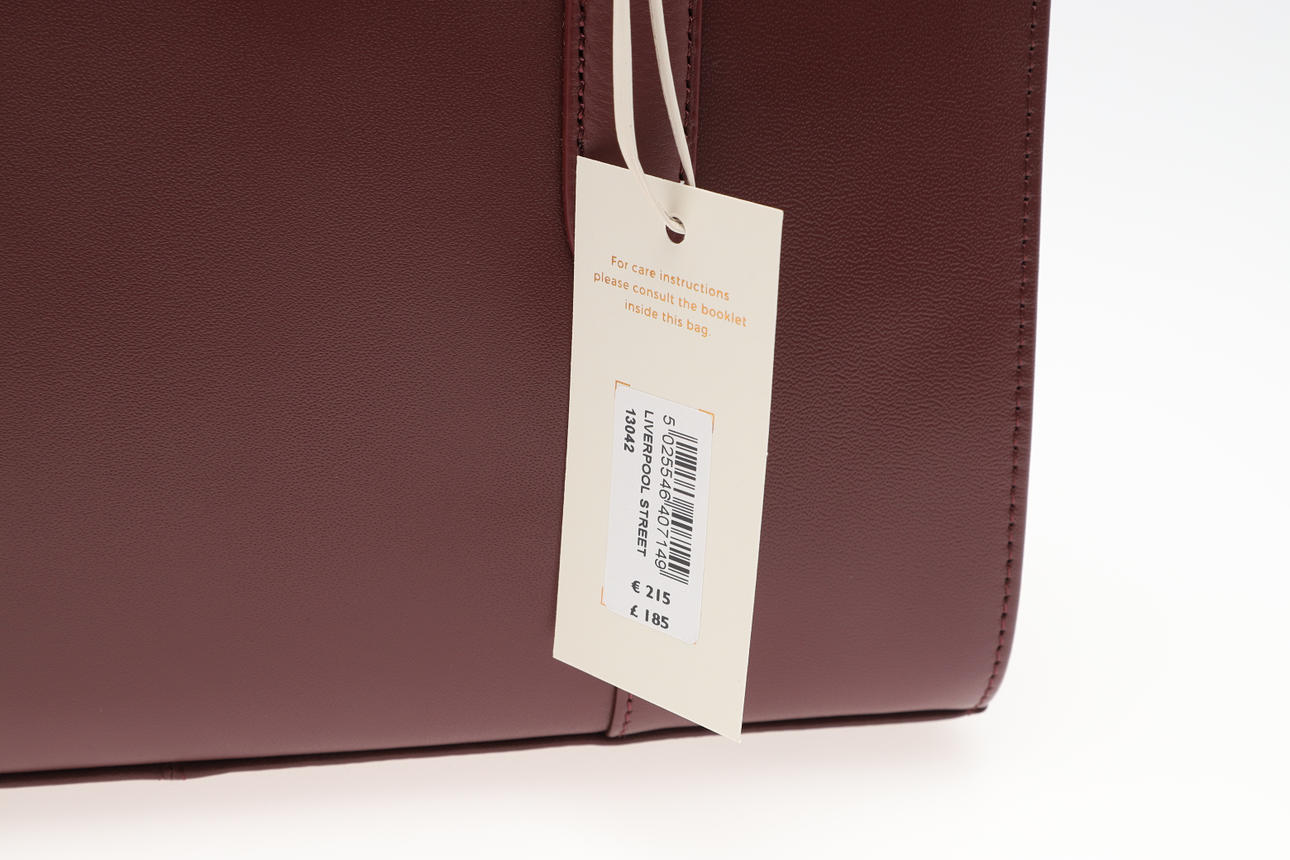 i mörk körsbär, med axelrem, rosa dammpåse, original återförsäljarens etikett och taggar, 33cm hög x 33cm bred.