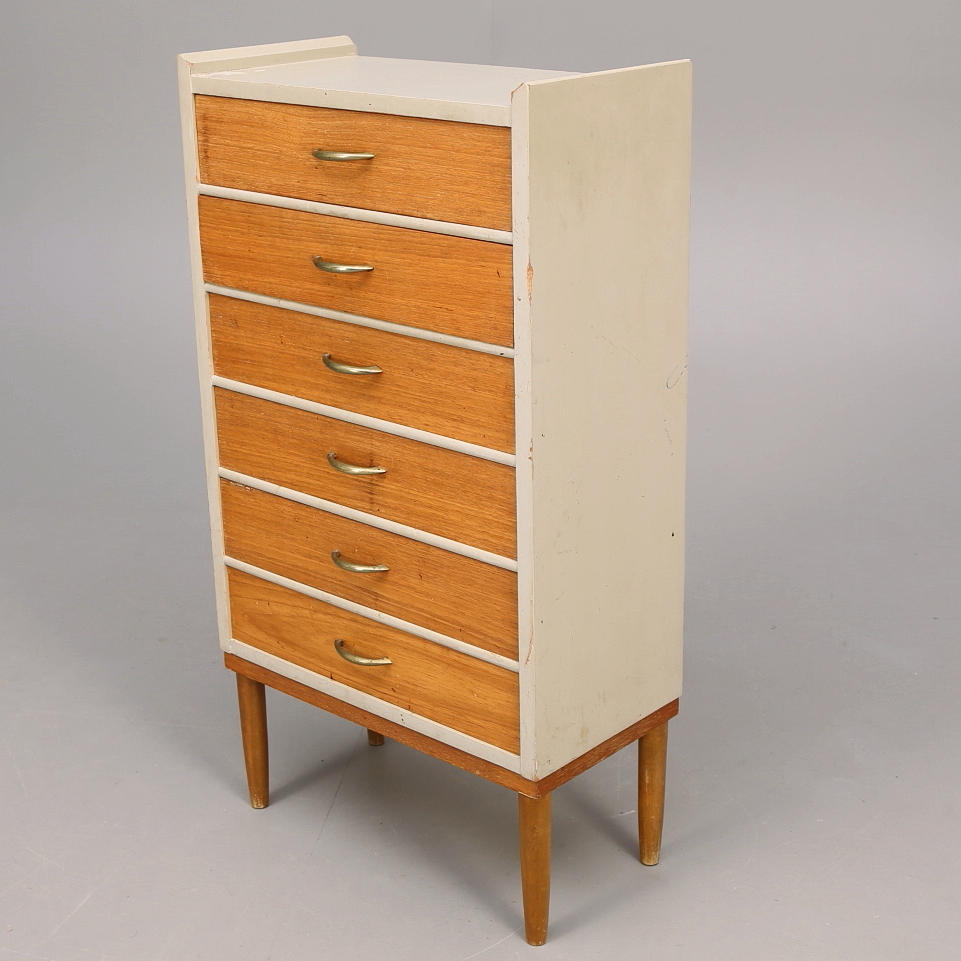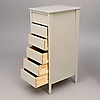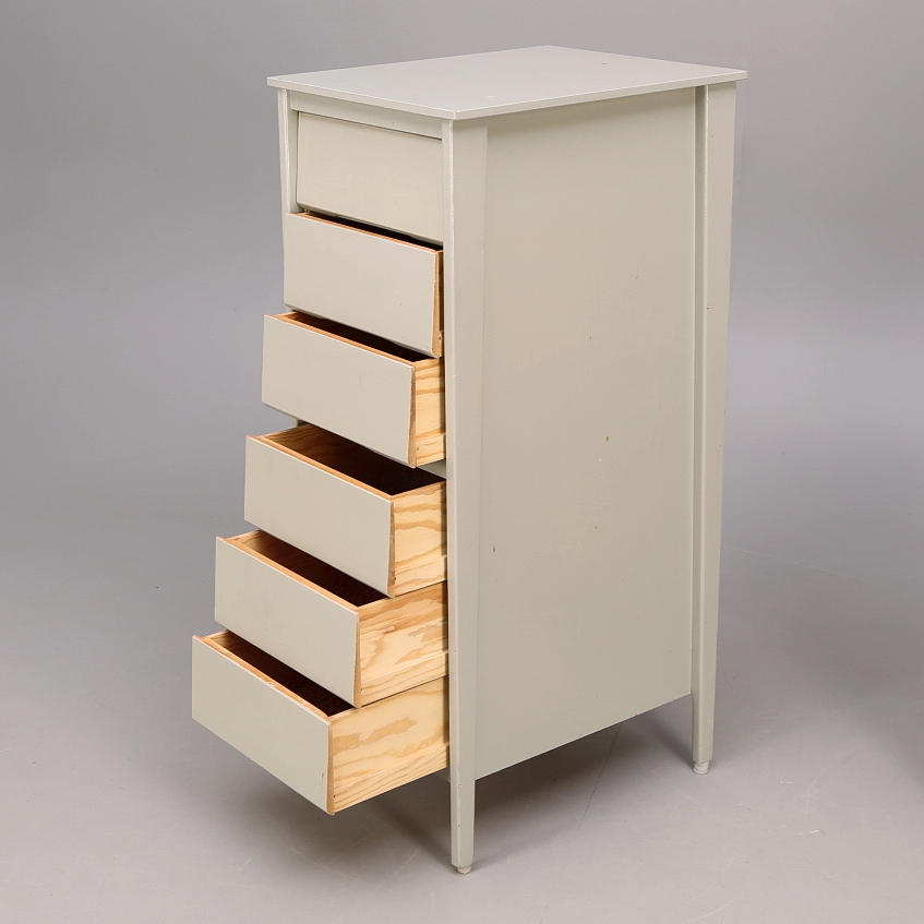 Byrå, 6-lådig, gråmålad, höjd 108, längd 41, bredd 53 cm. Byrå, 6-lådig, höjd 83, längd 46, bredd 23 cm.