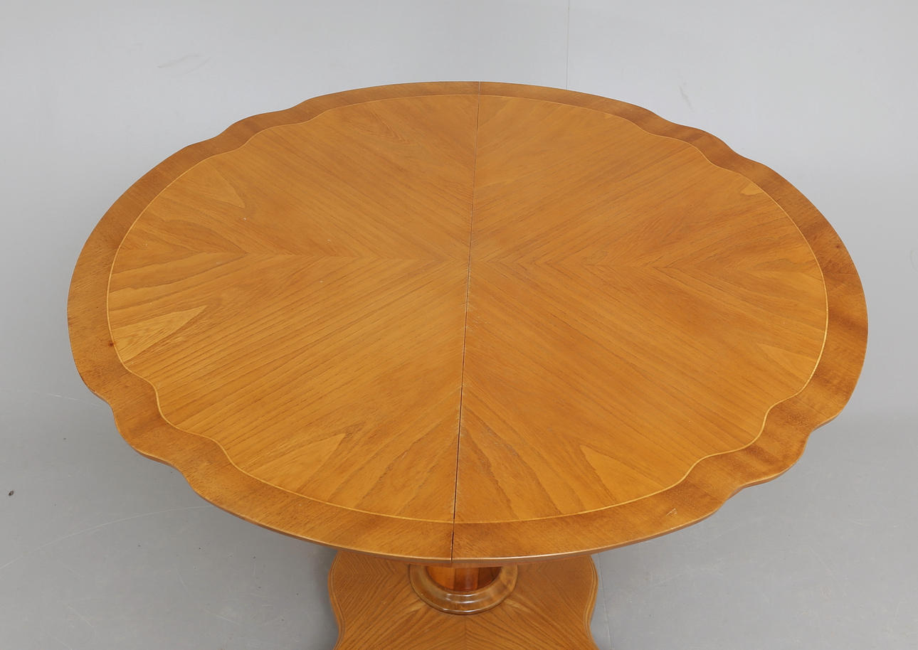Fanerat i almträ med intarsia. tvådelat. Höj och sänkbart.