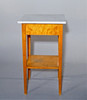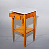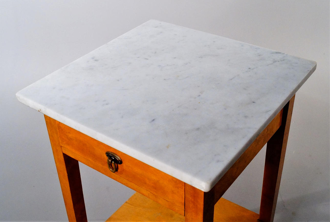 Underdel i trä, skiva i marmor. En utdragbar låda, ett hyllplan. Höjd 71 cm, skivans mått 40 x 40 cm.
