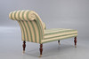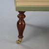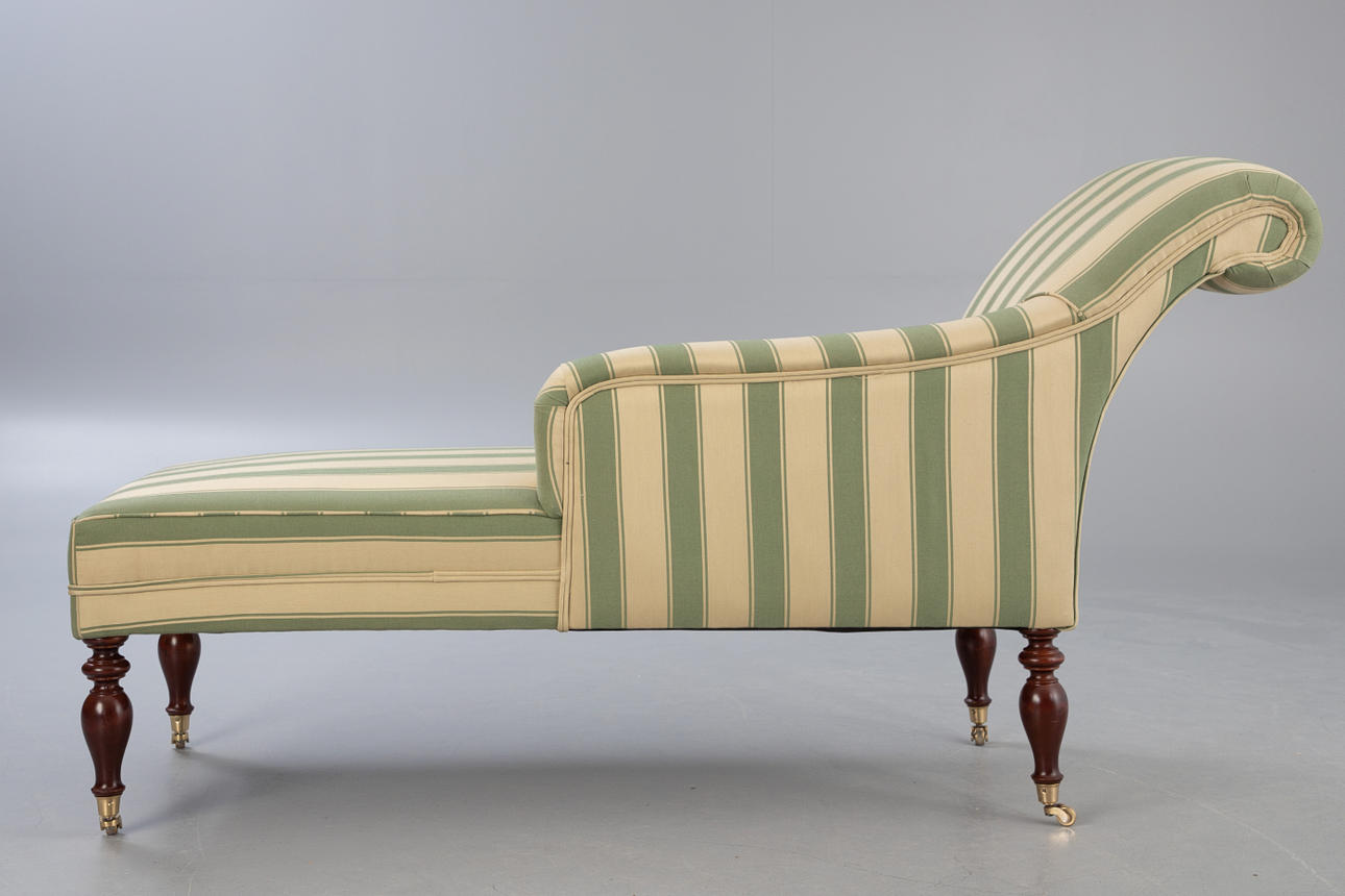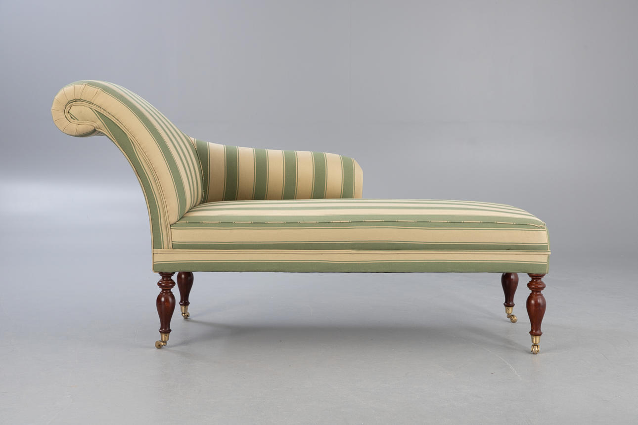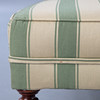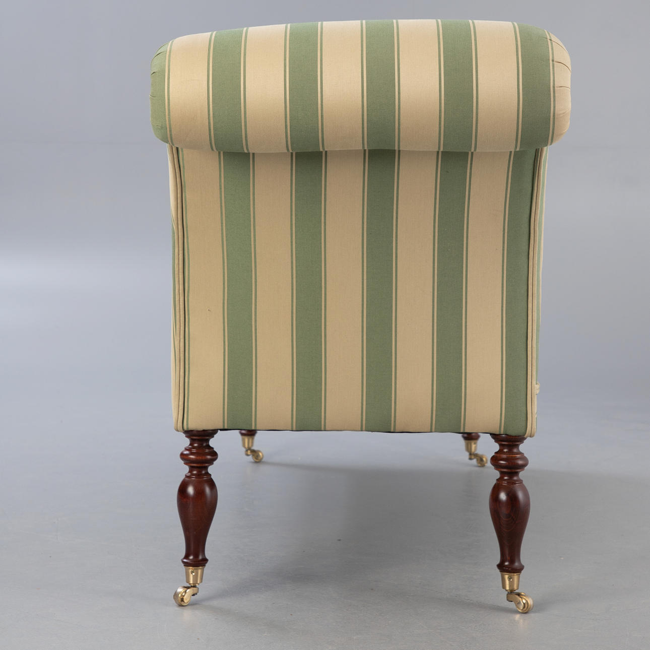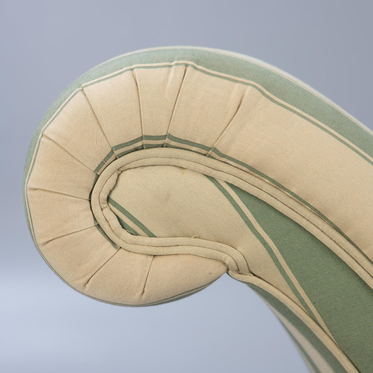 Smal, rektangulär, stoppad träram på mahognyfärgade lackerade balusterben. Svängande rygg och rakt armstöd Förstyvt tygöverdrag i grönt och olivgult. HxBxD: ca. 97 x 180 x 63 cm.
