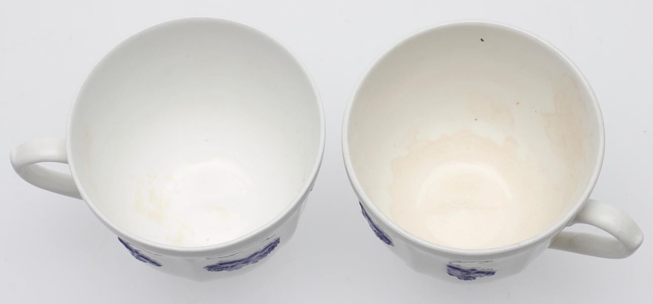 Bruksslitage. 2 koppar och ett fat med krackelyr och missfärgning.