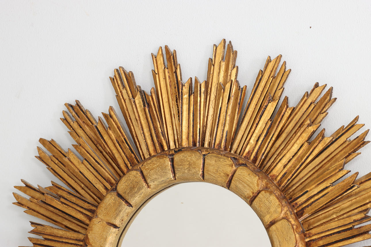 Solspegel, guldfärgat trä, 1900-talets andra hälft. Total diameter 66 cm Spegelglasets diameter 25,5 cm.