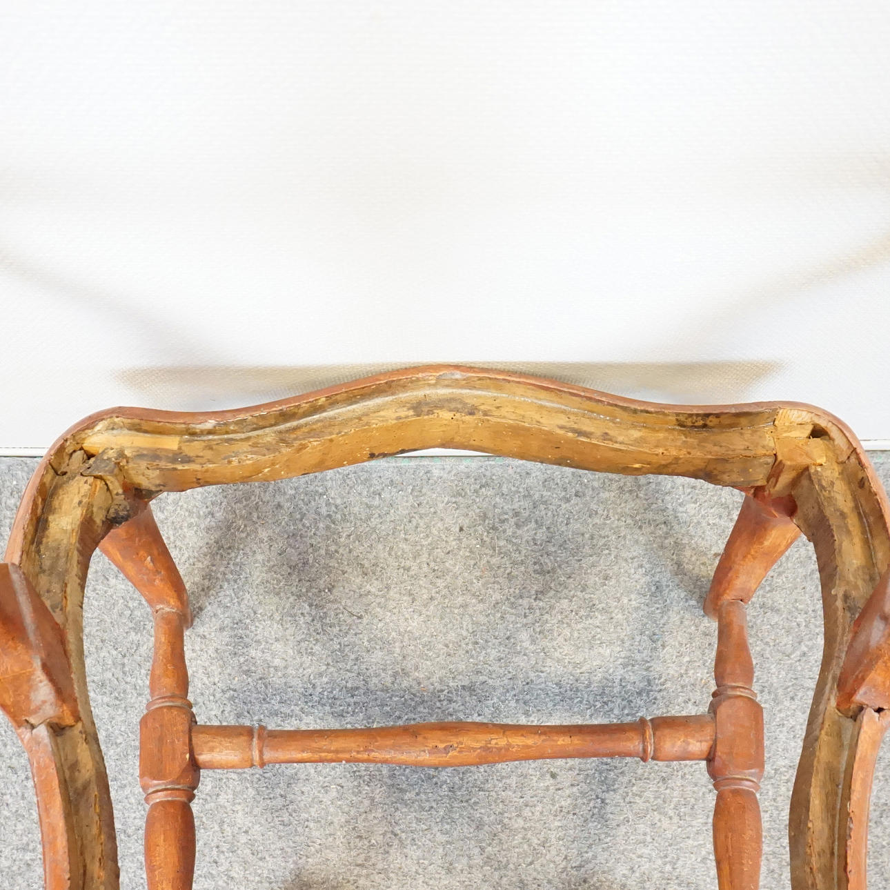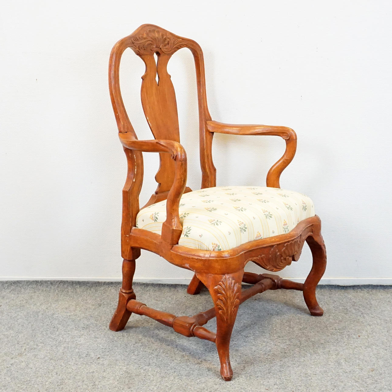 Skuren dekor. Träplugg. Lös stoppad sits. Rygghöjd ca 96, bredd ca 63, djup ca 54, sitthöjd ca 43 cm.