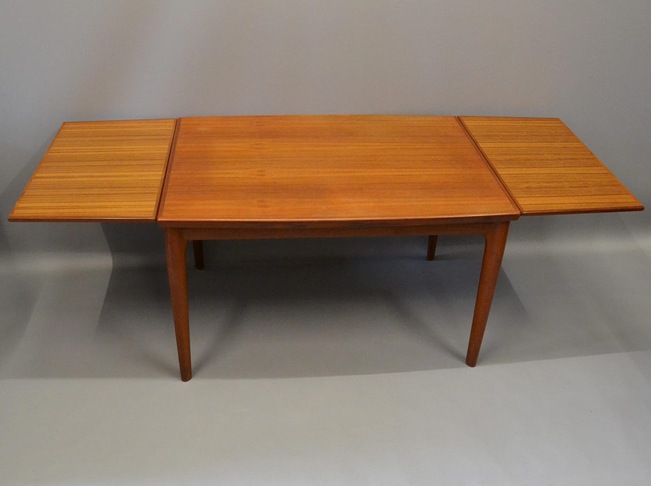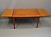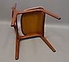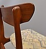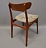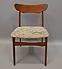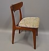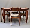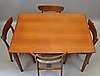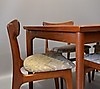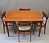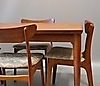 Teakbord och stolar, utdragbart bordsförlängning, stolar med textilöverdrag, stolarnas mått: höjd: 78 cm, sitthöjd: 46 cm, bordsmått: höjd: 73,5 cm, bredd: 119 cm, djup: 85,5 cm, förlängningsplattor 46 cm vardera.