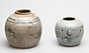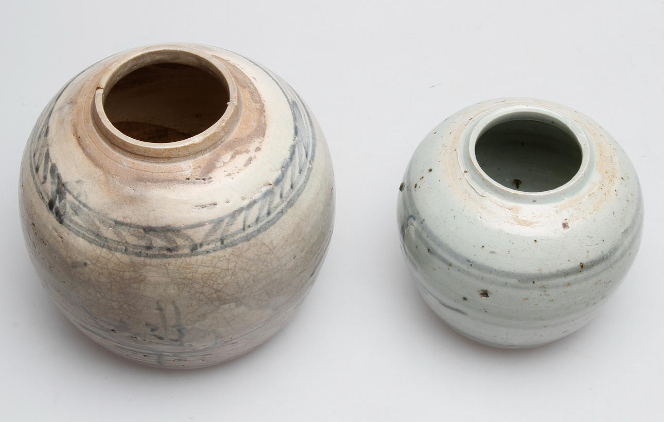 Lergods. Dekor i gråblått mot grå och vit fond.