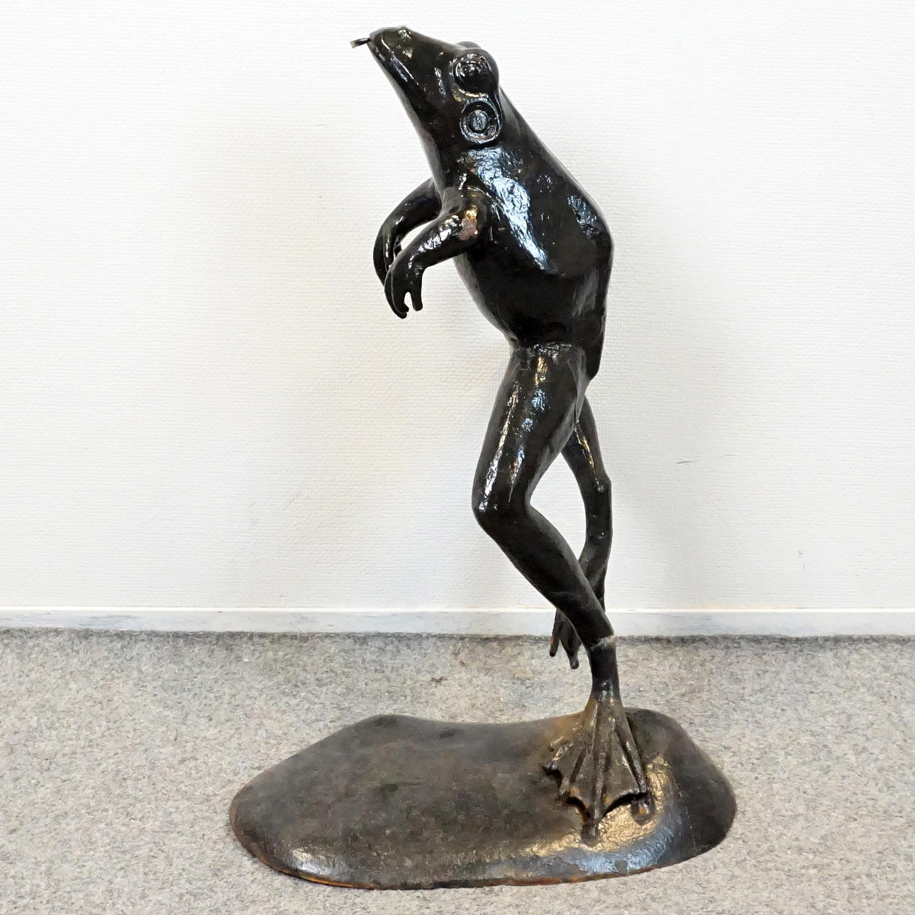 Trädgårdsfontän i form av hoppande groda. bemålad. Höjd ca 69 cm..